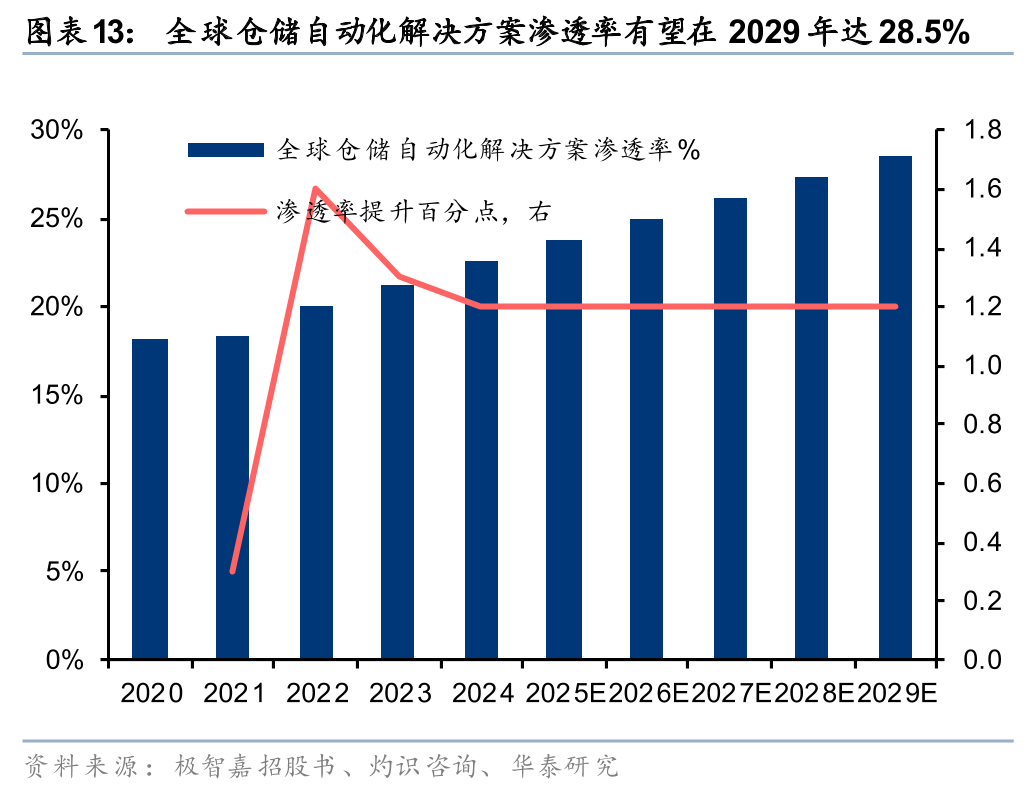 智能仓储让企业更了解自己的供应链状况也更了解终端客户的用户行为,从而使得企业从供应链库存到终端产品交付都更加可靠和高效,并有望实现物料搬运从场内无人化延伸至场外无人化,从而实现全流程的无人化发展。我们认为,智能仓储和物流解决方案不仅是物料的无人搬运,更是企业能快速通过数据了解库存和用户需求情况并快速做出调整的得力助手。2024年全球约80%的仓库尚未采用自动化解决方案,全球仓储自动化解决方案的总潜在市场超过2万亿人民币。2024年全球仓储自动化解决方案市场规模4711亿元,预计到29年达到8040亿元,CAGR4.8%。根据灼识咨询,中国智能场内物流解决方案市场规模有望从2024年1013亿元增长至2029年2010亿元,CAGR14.7%。在AI和数字化驱动以及企业对效率和降本的需求提升下,我们认为全球仓储自动化渗透率有望较快增长。