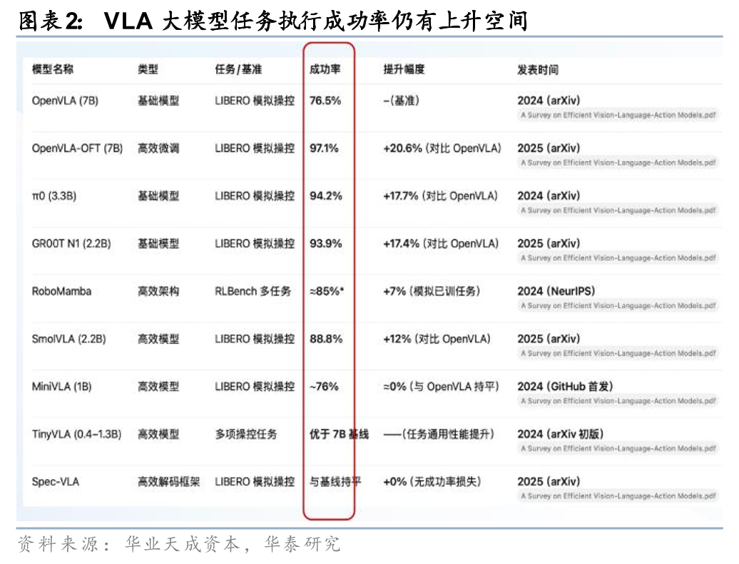 VLA大模型层出不穷,但整体成功率仍有提高空间。过去两年中,VLA机器人模型是产业界主要探索的方向,各种细分技术路线百花齐放。产业界巨头例如Figure、智元机器人、Nvidia和Google均在大小脑结合的VLA模型上有建树,不断推动产品落地。但目前采用VLA模型的机器人,其执行任务成功率均低于商用标准,考虑到现实生活中对于任务容错率的要求,该成功率仍有提升空间。