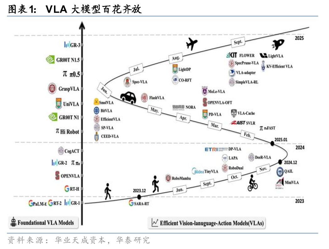认知引入阶段(2023年起): 行业主要探索将ChatGPT等具备强大认知能力的语言模型与视觉语言模型引入机器人系统。该阶段的模型与行为动作控制仍是分离的,属于“认知”与“行动”的初步结合。