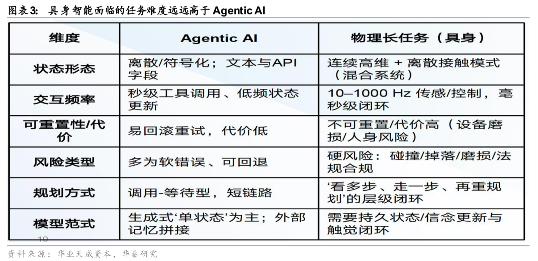 1、华业天成资本:产业界目前探索的机器人大脑VLA大模型百花齐放,但其任务执行成功率距商业化落地仍有距离。执行成功率偏低的主要原因在于现实世界中的长任务需要毫秒级闭环、连续高维状态与混合接触模式,状态密度远高于生成式模型,因此链路越长成功率越低。最终复杂任务的操作仍需灵巧手执行,目前“灵巧操作”瓶颈更多来自触觉与其系统级集成,而非单纯AI算法。