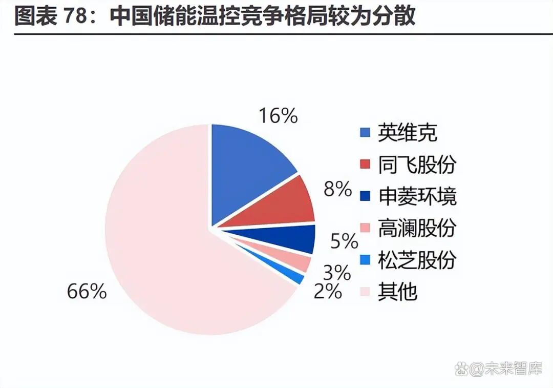 储能温控市场格局持续走向集中。目前,储能温控市场的参与者可以分为传统工业温控企业、精密温控企业和汽车电池热管理企业三类。传统工业温控企业凭借在水冷设备中的技术积累,切入储能温控壁垒较低,技术同源,代表企业如同飞股份、高澜股份等。精密温控企业在数据中心温度控制方面经验丰富,集装箱储能与数据中心温控相似性较高,有望实现技术外延,代表企业如英维克、申菱环境等。汽车电池热管理企业锂电池温控技术与经验积累丰富,代表企业如松芝股份、奥特佳等。根据,中研普华产业研究院,2023 年中国温控企业排名前五的分别是英维克、同飞股份、申菱环境、高澜股份、松芝股份,其他企业则占据 66%的市场份额。储能温控行业的行业集中度在近几年持续提升,从2020年到 2024 年,全国 Top3 企业销售额的行业占比从49.8%增加至63.9%,全国Top10 企业销售额的行业占比从 53.6%增加至 84.4%。
