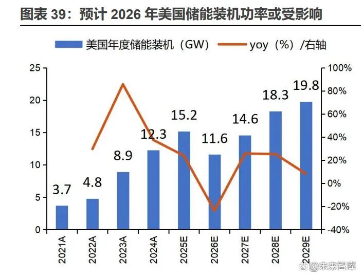 政策变动引发 25 年抢装潮,长期需求具备韧性。美国储能需求主要受关税、大而美法案影响较大,未来仍然存在政策变动的不确定性。我们分析,2025年,美国储能因关税影响及“受关注外国实体”条款而加速发货,2026 年储能需求会因政策变化而收缩,2027 年之后恢复增长。