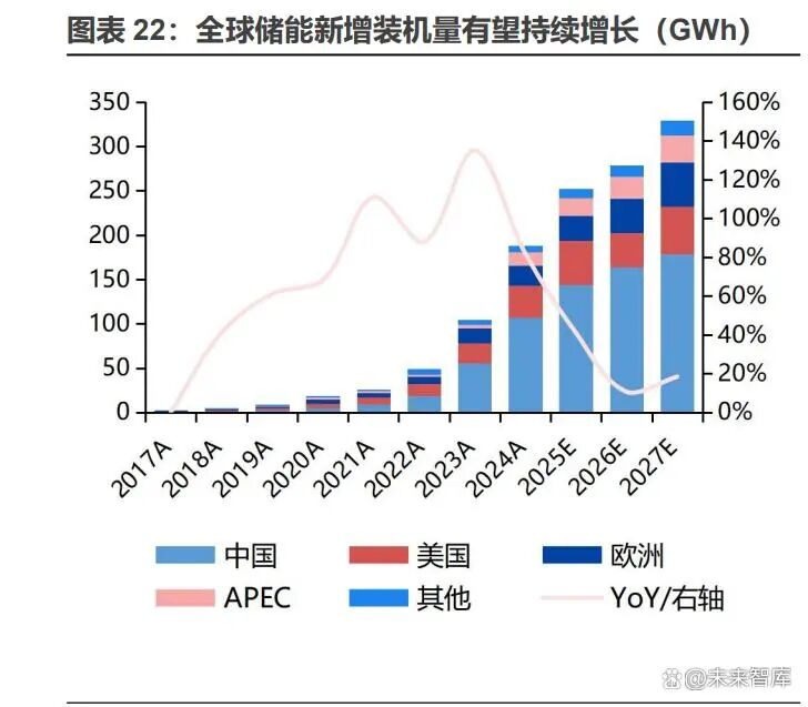 中美欧市场主导全球储能市场发展,新兴市场发展潜力大。据EESA统计,2017年以来全球新型储能市场需求持续增长,2019-2023年平均增速高达93%,2024 年新增装机约 188.5GWh,同比增长 80%,其中中国占比57%,美国占比19%,欧洲国家占比 12%,三地区共占全球新增装机量的88%,是推动全球储能市场发展的主力。 展望:我们预计 2025-2027 年全球储能新增装机量将持续增长。1)中国市场:新增装机量由电网侧储能驱动,2024 年占比 60.0%,较2023 年增加7.6%;其中独立储能占57.6%,是最主要的装机应用场景,随着各地配建储能转独立储能政策的推进,预计 2025 年独立储能新增装机占比将会持续增高。但考虑地面电站光伏新增装机增速放缓,工商储潜力较大,预计中国储能需求将平稳小幅增长。2)美国市场:装机以大储为主,户储需求将随着加州NEM3.0政策推动和利率的持续下探小规模增长。预计 2025 年美国储能因关税影响及“受关注外国实体”条款而加速发货,2026 年储能需求会因政策变化而收缩,2027年之后恢复增长。3)欧洲市场:以户储需求高而被熟知,主要市场为德国、意大利和英国等地。为了完成净零排放,欧洲需要继续保持光伏年装机增长,带动储能需求增长,结构上欧洲工商业储能及大储需求增速较户储更显著。3)新兴市场:除了中美欧三大传统市场以外,新兴市场中 APEC 占比8%,其他地区占比4%。虽然目前新兴市场占比低,但预计受刚需和电价等现实因素影响,叠加强制或补贴等政策因素驱动,这些地区需求发展潜力较大。综上,预计全球储能2025年将继续保持较快增长,2026 年全球储能因美国政策波动、中国源网侧储能装机逐渐饱和而增速有所放缓,2027 年随着欧洲大储的快速崛起以及新兴市场持续增长带动全球增速有所反弹。