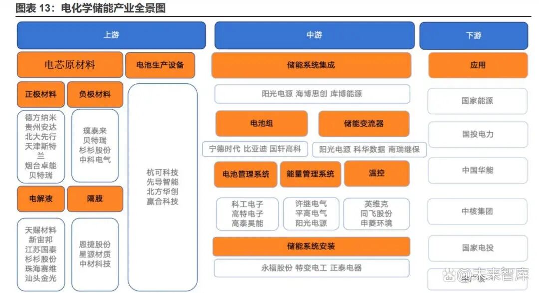 电化学储能系统主要由电池、PCS、EMS、BMS、温控等组成。电化学储能系统主要由电池组、电池管理系统(BMS)、能量管理系统(EMS)、储能逆变器(PCS)以及其他电气设备构成,最终应用场景包括电站、电网公司、工商业、家庭户用等。 上游:储能电池是电化学储能的主要载体,我国储能电池以磷酸铁锂电池为主,储能电池产业链上游以磷酸铁锂电池原材料为主,包括正极材料、负极材料、隔膜、电解液等。电池集成系统设备主要包括涂布机、搅拌机等。在上游领域,电芯原材料代表企业有德方纳米、贵州安达、贝特瑞、天赐材料、恩捷股份、星源材质等公司;电池生产设备商有杭可科技、先导智能、北方华创、赢合科技(维权)等企业。 中游:在产业链中游,电池组制造的代表企业有宁德时代、比亚迪、海基新能源、国轩高科等;电池管理系统制造代表企业有科工电子、高特电子、高泰昊能等;储能变流器制造代表企业有阳光电源、科华恒盛、南瑞继保等;能量管理系统制造代表企业有派能科技、国电南瑞、中天科技、平高电气等;储能系统集成代表企业有阳光电源、海博思创等;储能系统安装代表企业有永福股份、特变电工、正泰电器、中国电建、中国能建等。 下游:产业链下游为储能电池的应用。储能电池的应用领域包括电源侧、电网侧和用户侧。电源侧储能的主要需求为光伏、风力等可再生能源并网,平滑电力输出;电网侧储能以电力辅助服务为主;用户侧储能主要为分时管理电价。其中,电源侧应用最广泛。产业链下游系统应用代表企业主要有国家能源、国投电力、中国华能、中核集团等。