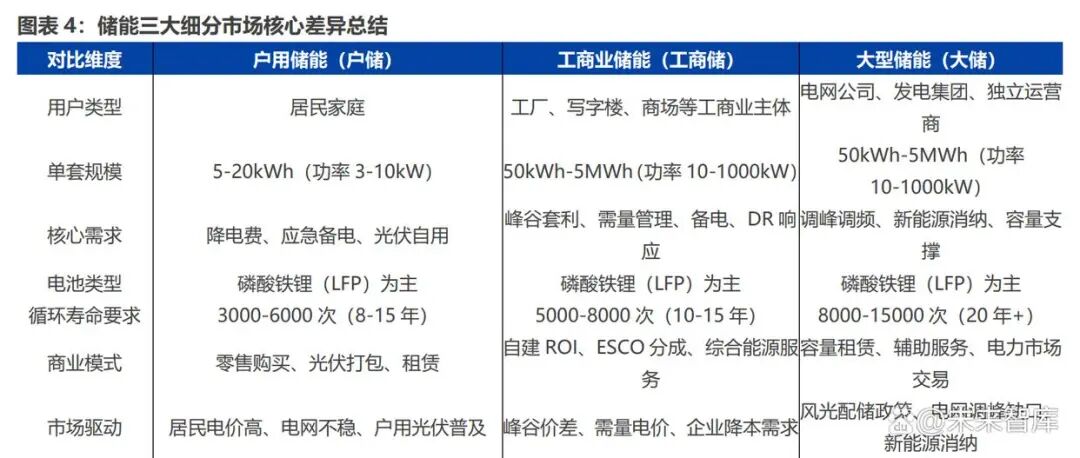 按实际的应用场景看,储能分为户用储能(户储)、工商业储能(工商储)、大型储能(大储、公用事业级储能),三类场景储能所实现的功能有所差异。1)户储:指安装在家庭住宅中的储能系统,用于储存来自太阳能板或其他可再生能源发电设备产生的电力,以供夜间或阴天时使用,也可以作为备用电源应对停电情况。应用场景包括家庭日常用电、分布式光伏配套、离网地区供电。2)工商储:面向企业、工厂、商场等非居民用户的储能解决方案,旨在优化用电成本、提高供电可靠性,并参与电网服务如调频调峰等。应用场景包括制造业、数据中心、医院、商场等对电力质量和供应可靠性要求高的场所。3)大储:服务于电网侧或电源侧的大规模储能项目,用于电力调峰、调频、备用电源及可再生能源并网支持。应用场景包括电网调峰调谷、可再生能源并网、跨区域电力调度、应急备用电源。