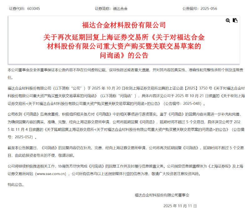 11月11日,福达合金发布公告披露,公司再次延期回复上海证券交易所《关于对福达合金材料股份有限公司重大资产购买暨关联交易草案的问询函》的公告。福达合金在公告中指出,截至公告披露日,《问询函》的回复内容仍在补充、完善,经向上海证券交易所申请,公司将再次延期回复《问询函》,延期时间不超过5 个交易日。