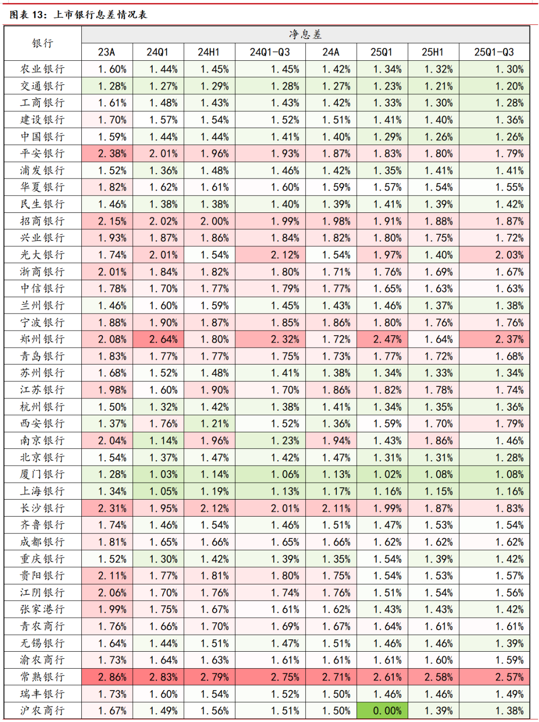 分银行类型来看,2025年前三季度国有行、股份行、城商行、农商行净息差分别为1.30%、1.49%、1.36%、1.49%,环比分别降0.65BPs、升0.97BPs、1.24BPs、0.01BPs。除了国有行净息差微幅下滑之外,其余各类银行净息差均现企稳。