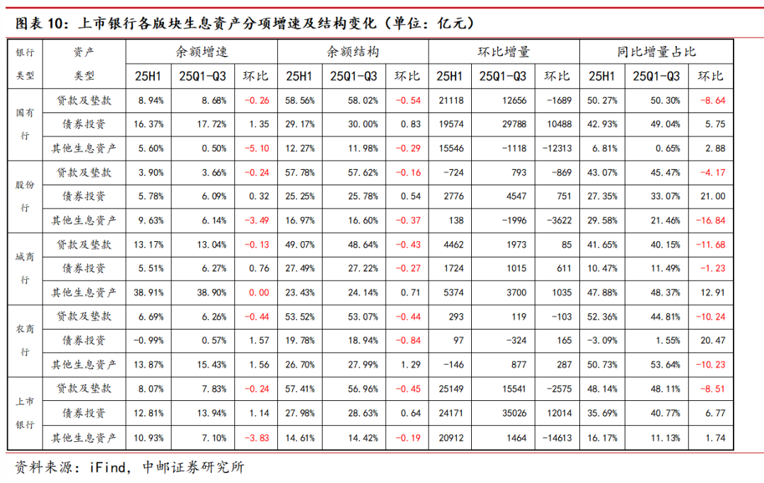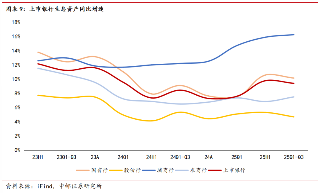 2025年前三季度上市银行合计生息资产同比增速9.40%,增速较2025上半年的9.77%环比小幅下降0.37pct。其中,国有行、股份行、城商行、农商行各自生息资产同比增速分别达10.14%、4.69%、16.25%、7.50%,城商行、农商行生息资产增速均有进一步提升,城商行、国有行增速保持在10%以上。