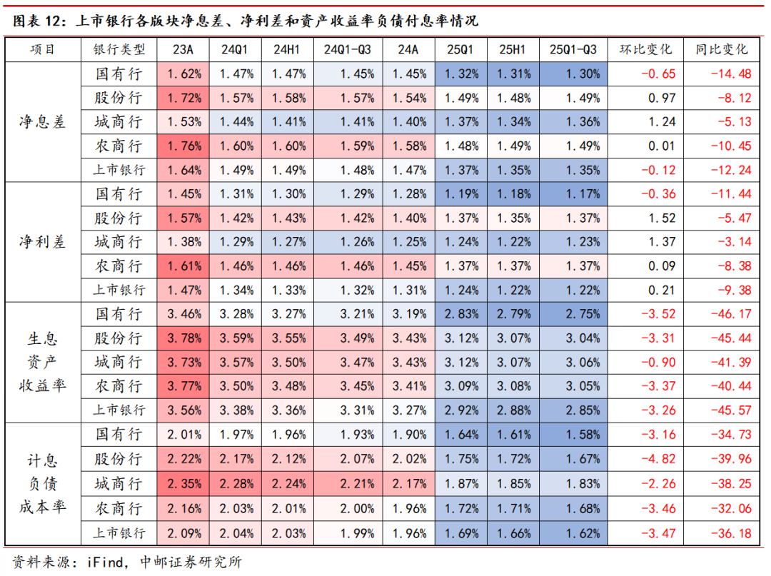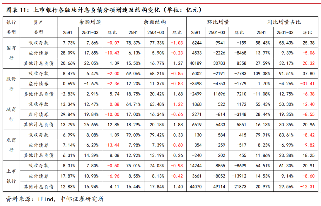 生息资产保持增长,主动负债扩张降速:2025年前三季度上市银行合计生息资产同比增速9.40%,上市银行贷款及垫款、债权投资分别增7.83%、13.94%;计息负债中,吸收存款、主动负债规模增速分别为7.80%、10.90%,仍需关注后续存款搬家影响。