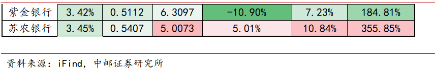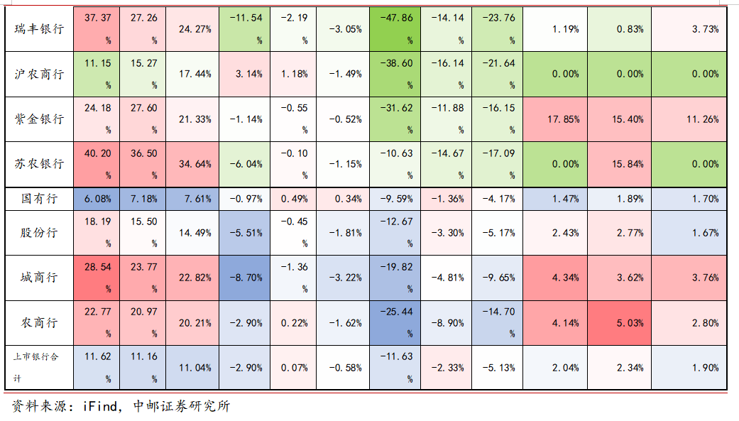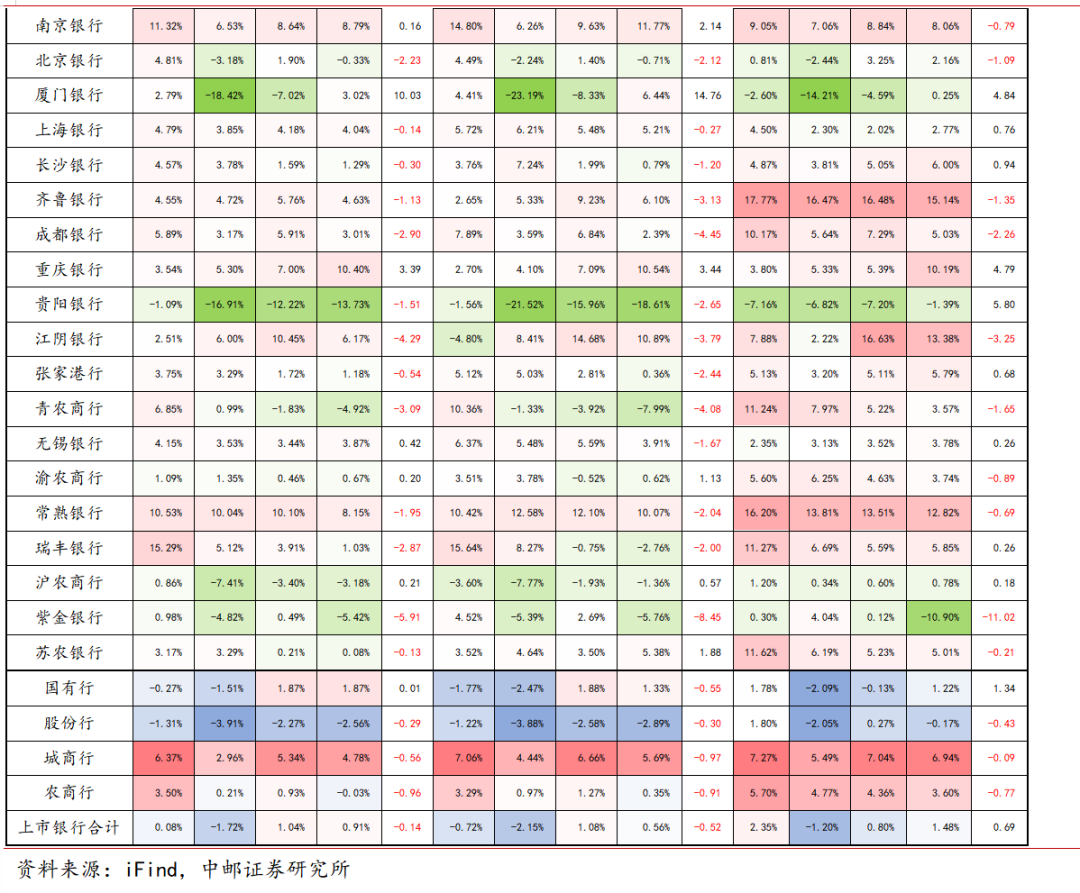 分银行类型来看,城商行吸收存款与主动负债规模增速均为最高,分别达12.47%、19.84%,显著高于上市银行整体水平;国有行主动负债规模增速相对突出,达到17.65%,吸收存款增速7.66%,后者与上市银行整体水平相近;农商行与股份行的债券融资增速均转负,分别为-6.29%、-1.67%,环比分别下行13.44、2.36pct。此外股份行吸收存款规模增速相对偏慢,仅为6.47%,与上市银行整体水平存在一定差距,或存在一定揽储压力。
