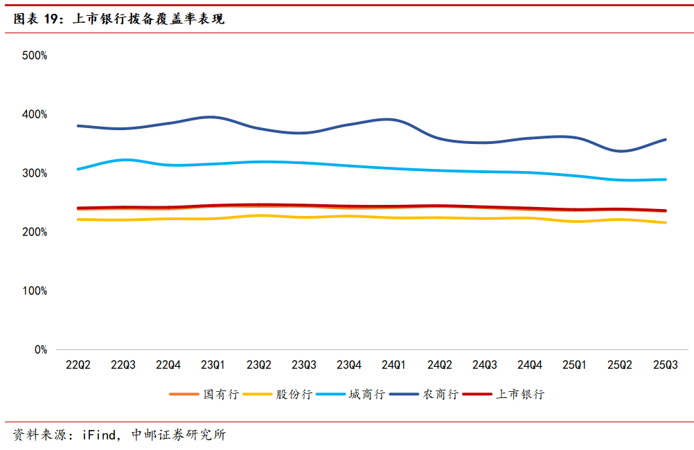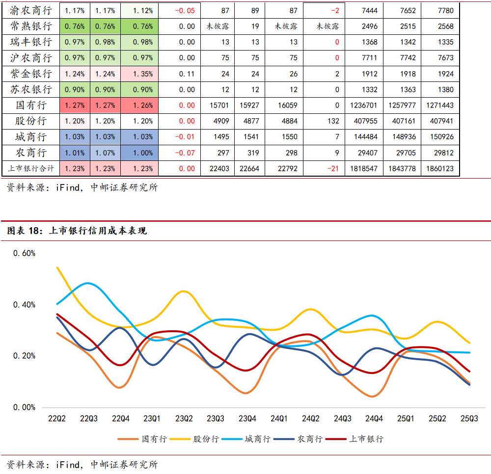 信用成本角度,从2022年至今上市银行各期定期报告数据来看,读数显现了较强的周期性波动。截至2025年三季度末,上市银行整体信用成本约0.14%,国有行、股份行、城商行、农商行信用成本分别为0.09%、0.25%、0.21%、0.09%,较2024年同比与2025年上半年环比均取得显著下行;从拨备覆盖率来看,截至2025年三季度末,上市银行总体拨备覆盖率约235.98%。分版块来看,国有行、股份行、城商行、农商行2025年三季度末拨备覆盖率分别为234.88%、215.47%、288.82%、356.72%,部分相较上半年末出现小幅下行。