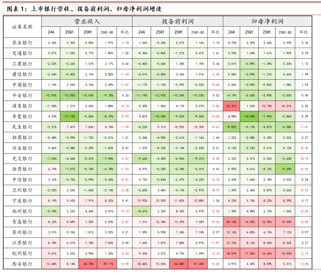 分银行类型来看,2025年前三季度城商行营收表现仍保持强势,营业收入、拨备前利润、归母净利润指标均显著好于其他银行类型;国有行表现良好,营业收入与拨备前利润均保持小幅正增长,归母净利润增速转正,各行普遍录得正增长;农商行表现次之,股份行表现相对靠后,三项指标均录得负增长。