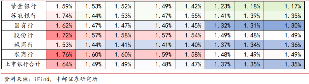 净息差下行趋势企稳:上市银行前三季度净息差1.35%,与上半年基本持平,除国有行微幅下滑之外其余均企稳。各类银行生息资产收益率与计息负债成本率普遍下行,负债端成本下行幅度稍大。