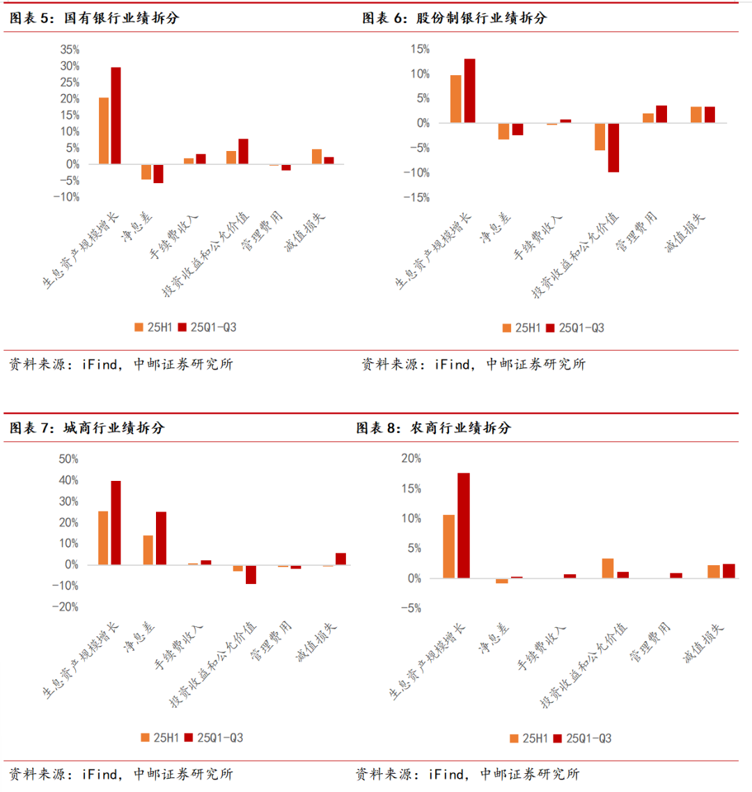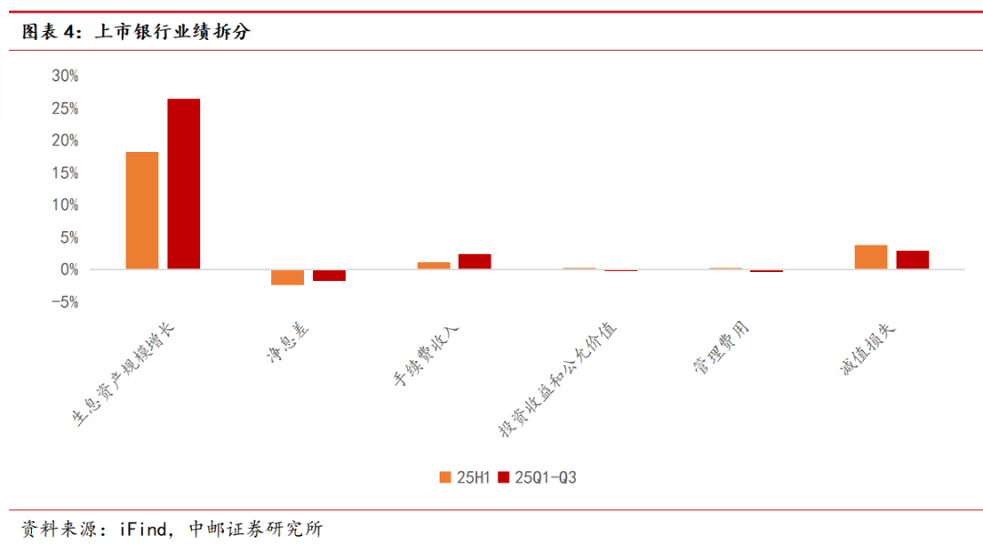 拆分业绩驱动因素,从2025年前三季度上市银行合计归母净利润增长驱动因素来看,生息资产规模增长为主要驱动因素,且2025年前三季度相较于2025年上半年程度进一步上升。此外,另两项主要驱动因素为减值损失下降、手续费收入,其中手续费收入重要性有所提升。拖累项方面,净息差、投资收益以及管理费用均在2025年前三季度对于业绩形成一定拖累。其中随着三季度净息差表现边际企稳,前三季度净息差整体拖累程度相对上半年有明显收窄。