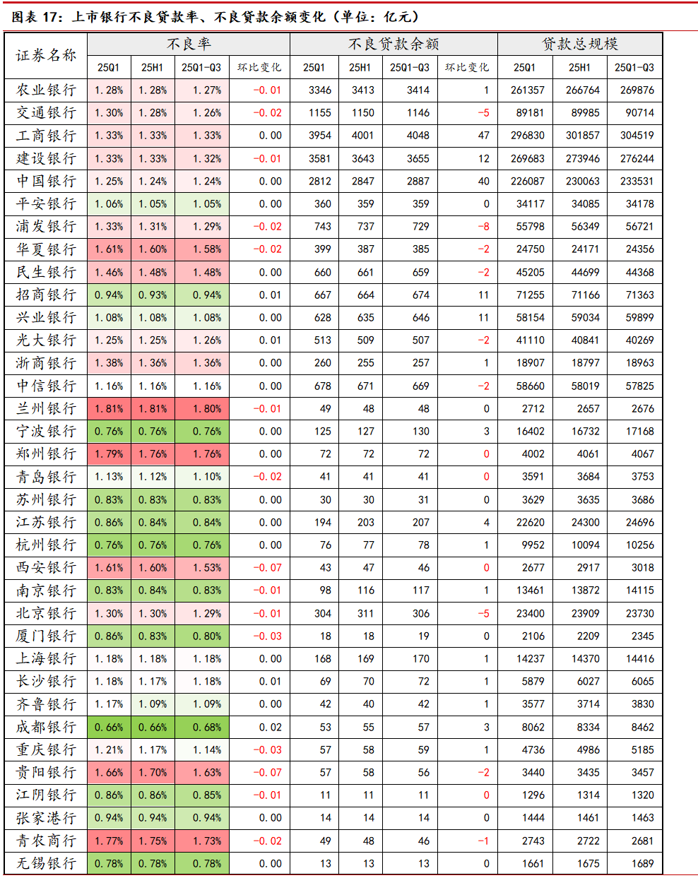 总体来看,截至2025年三季度末,上市银行资产质量整体稳健,贷款不良率稳中有降,信用成本波动中稳步下行,拨备覆盖率小幅下行。展望后续,随经济基本面修复、权益市场回暖、政策刺激进一步落地,资产质量有望保持稳健提升趋势,出现快速恶化概率较小。