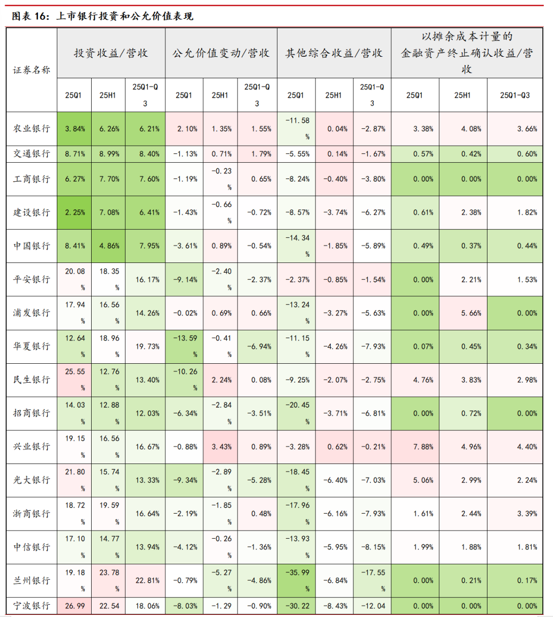 2025年三季度,债券市场迎来显著调整。从上市银行投资收益和公允价值表现来看,部分银行交易盘以公允价值计量且计入当期损益的债券(FVTPL)出现浮亏,且亏损银行所占比例相对上半年明显扩大,上市银行整体公允价值变动比营收规模为-0.58%,再度转负。其中,国有行、股份行、城商行、农商行各自占比分别为0.34%、-1.81%、-3.22%、-1.62%,仅国有行录得浮盈。部分银行通过出售配置盘摊余成本计量的债券(AC)和公允价值计量且计入其他综合收益的债券(FVOCI)兑现收益增厚营收的情况有所减少,以摊余成本计量的金融资产终止确认收益占营收规模从2025年上半年的2.34%降至1.90%,国有行、股份行、城商行、农商行各自占比分别为1.70%、1.67%、3.76%、2.80%。