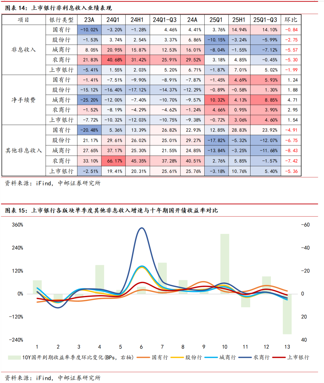 2025年前三季度上市银行非息收入总体增速为5.02%,继上半年非息收入增速转正后有所下滑,环比降1.99pct。前三季度净手续费收入与其他非息收入增幅分别为4.60%、5.40%,相较2025年上半年环比分别增1.54pct、降5.36pct。其中,手续费收入在上半年增速转正之后增速进一步扩大,而其他非息收入则因三季度债市持续调整而受到明显扰动。