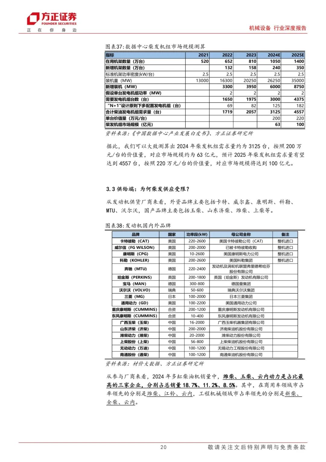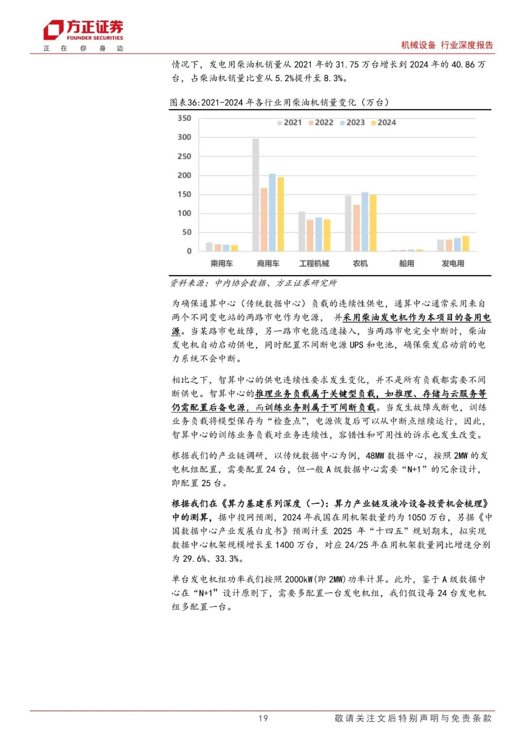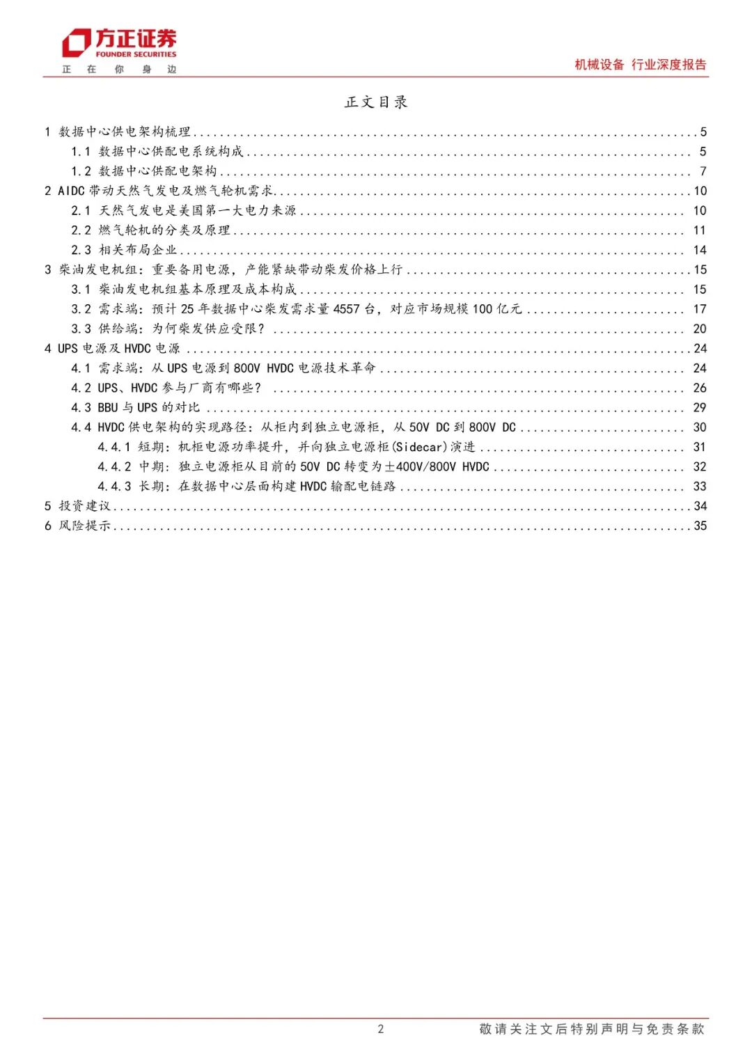 柴油发电机组:重要备用电源,产能紧缺带动柴发价格上行。柴油发电机是重要备用电源,作为一种自备型电站交流应急供电设备已经越来越广泛的被应用于各大领域。从需求端看,我们预计2025年数据中心柴发机组需求量有望达到4557台,对应市场规模将达到100亿元。而从供给端看,当前发动机产能扩张受限主要有两个原因:1)主机厂担忧大功率发动机各下游未来景气度波动;2)燃油系统、机体、曲轴等核心零部件供应瓶颈。重点关注柴发主机厂潍柴重机、动力新科。代工厂主要包括科泰电源、泰豪科技、苏美达,核心零部件供应商长源东谷、天润工业等。