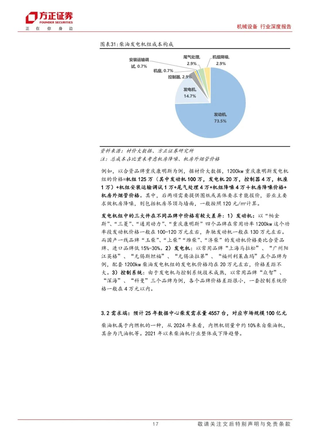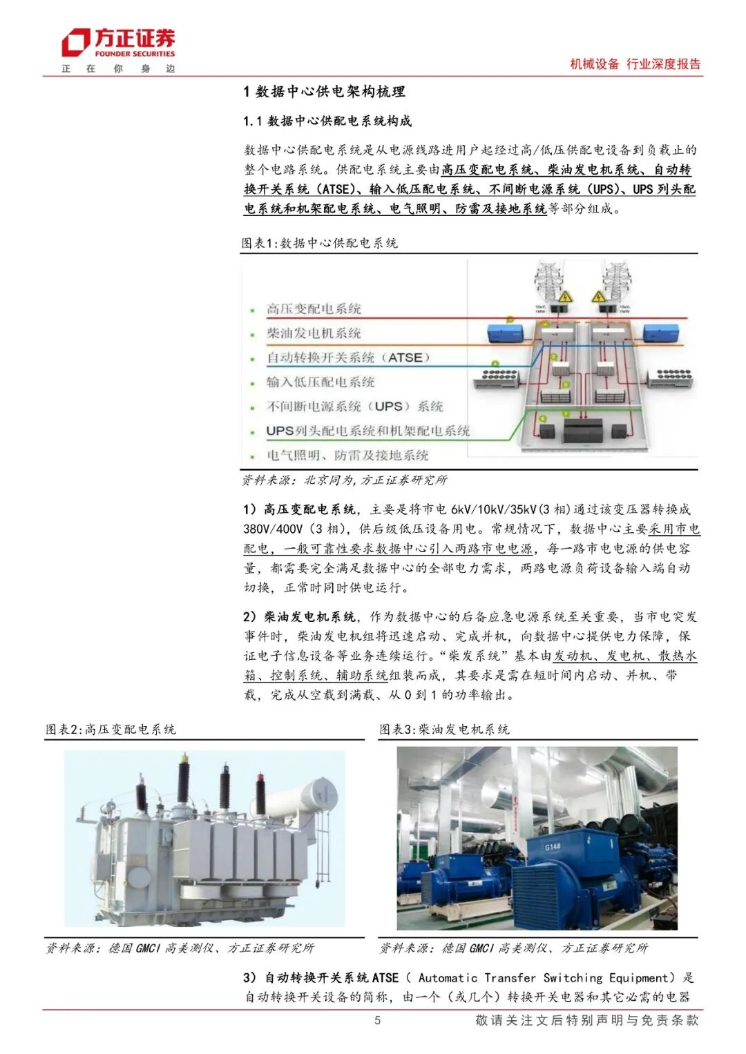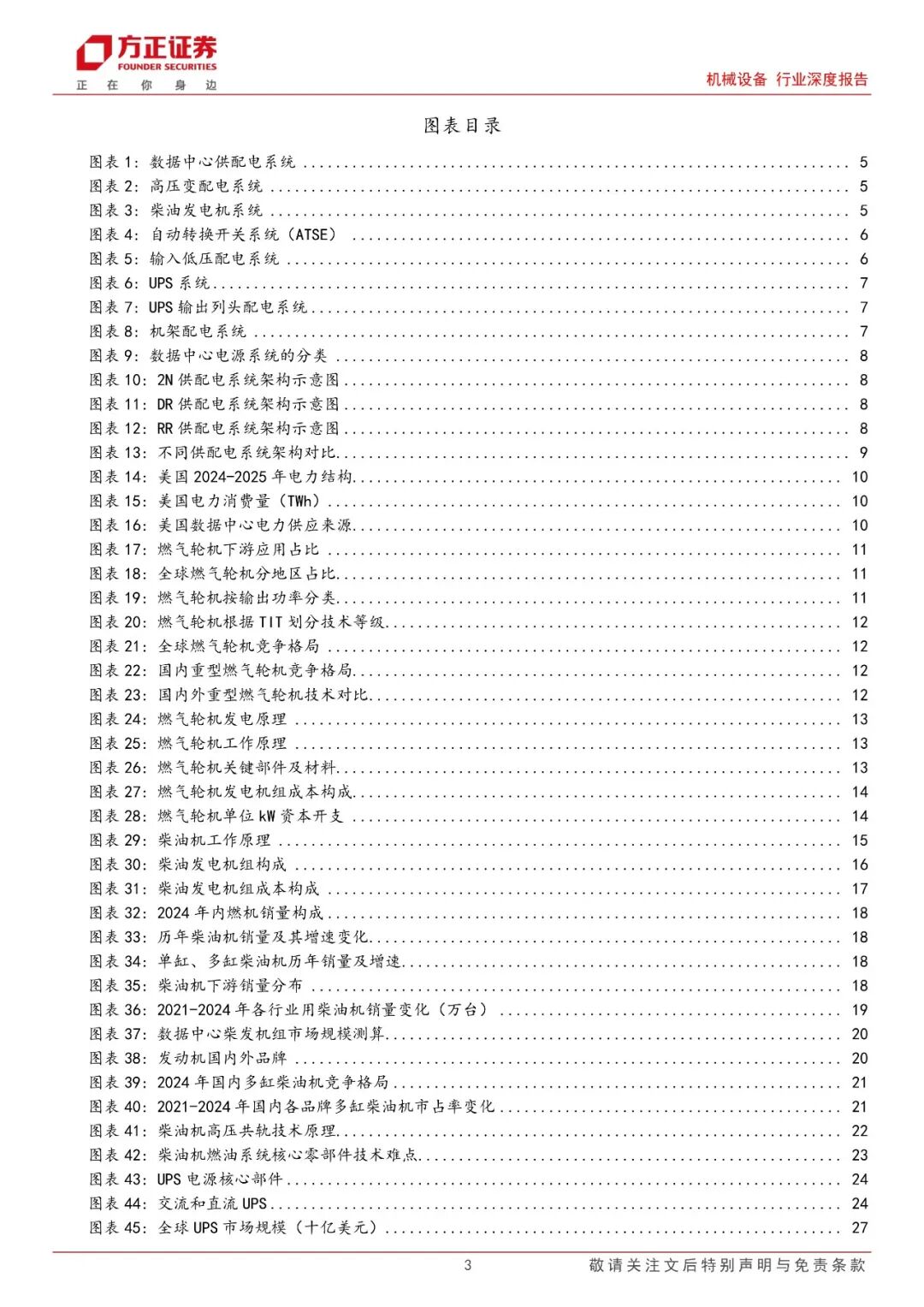 柴油发电机组:重要备用电源,产能紧缺带动柴发价格上行。柴油发电机是重要备用电源,作为一种自备型电站交流应急供电设备已经越来越广泛的被应用于各大领域。从需求端看,我们预计2025年数据中心柴发机组需求量有望达到4557台,对应市场规模将达到100亿元。而从供给端看,当前发动机产能扩张受限主要有两个原因:1)主机厂担忧大功率发动机各下游未来景气度波动;2)燃油系统、机体、曲轴等核心零部件供应瓶颈。重点关注柴发主机厂潍柴重机、动力新科。代工厂主要包括科泰电源、泰豪科技、苏美达,核心零部件供应商长源东谷、天润工业等。