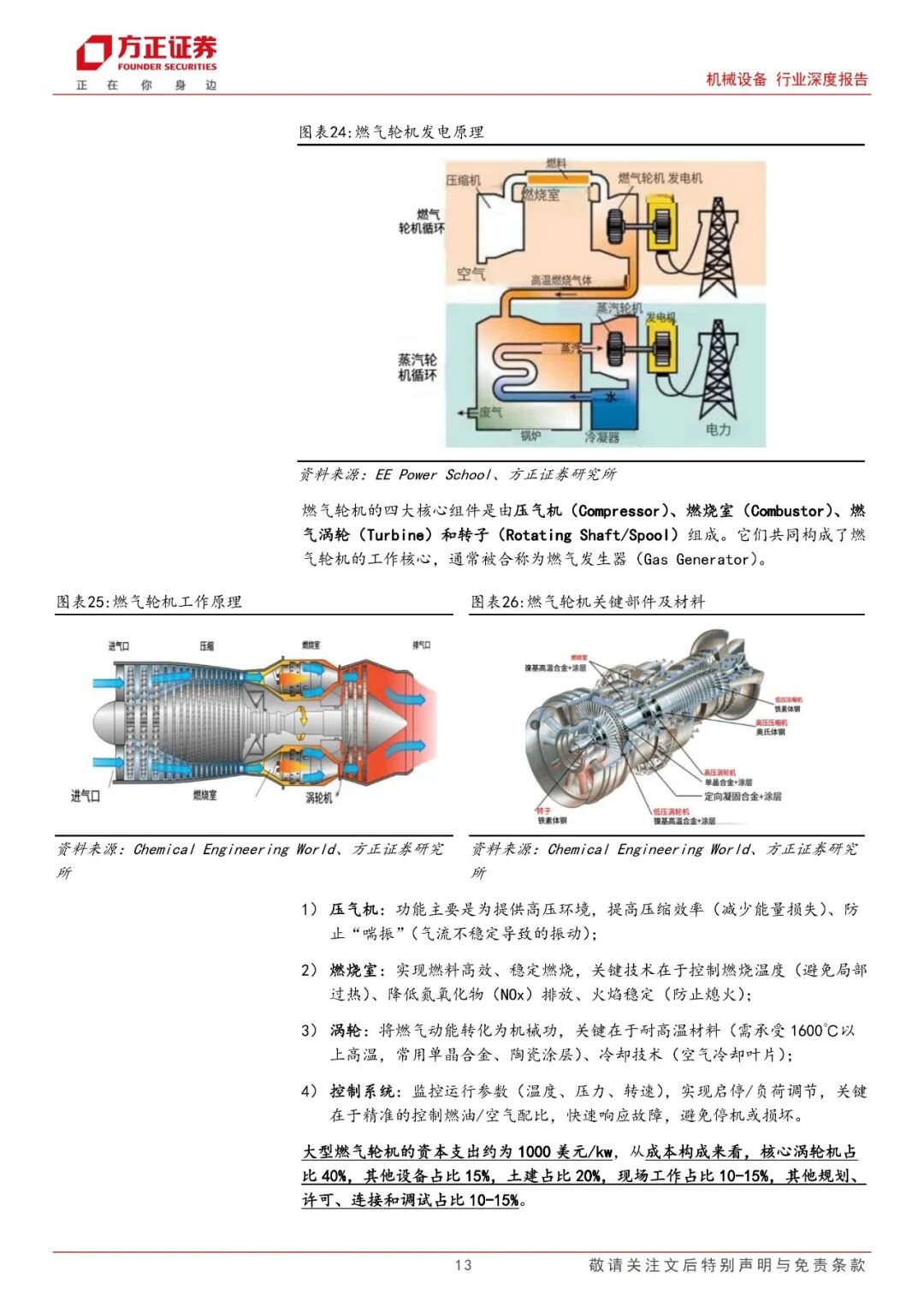 海外尤其是美国以天然气发电为主,AIDC发展带动燃气轮机需求。据IEA数据,天然气发电占美国数据中心电力来源的40%。大型燃气轮机的资本支出约为1000美元/kw,从成本构成来看,核心涡轮机占比40%,其他设备占比15%,土建占比20%,现场工作占比10-15%,其他规划、许可、连接和调试占比10-15%。从供应格局来看,目前全球燃气轮机市场主要有三菱、西门子、GE等,2024年市占率分别为35.6%、24.5%、16.2%,合计市占率超76.3%。国内重点关注高温合金透平叶片供应商应流股份、从油气行业向AIDC行业发展的燃气轮机供应商杰瑞股份、燃气轮机核心零部件供应商联德股份等。