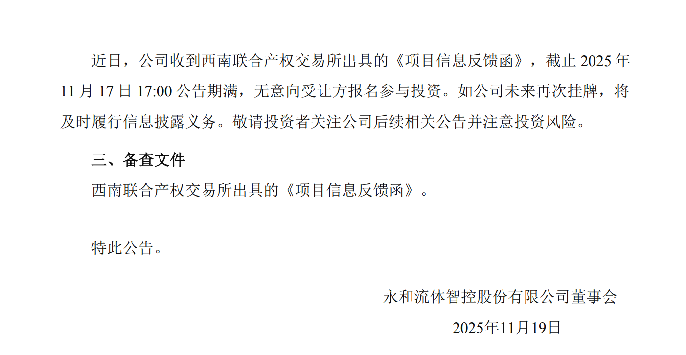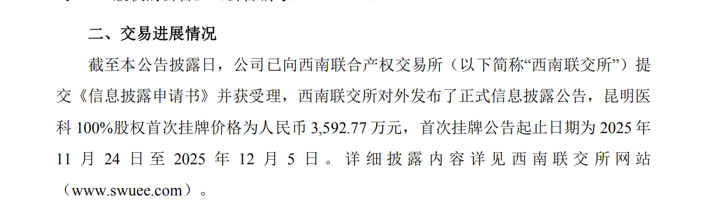 11月24日,永和智控发布公告,截至公告披露日,公司已向西南联合产权交易所(以下简称“西南联交所”)提交《信息披露申请书》并获受理,西南联交所对外发布了正式信息披露公告,昆明医科 100%股权首次挂牌价格为 3,592.77 万元,首次挂牌公告起止日期为2025年11 月 24 日 至 2025 年 12 月 5 日。