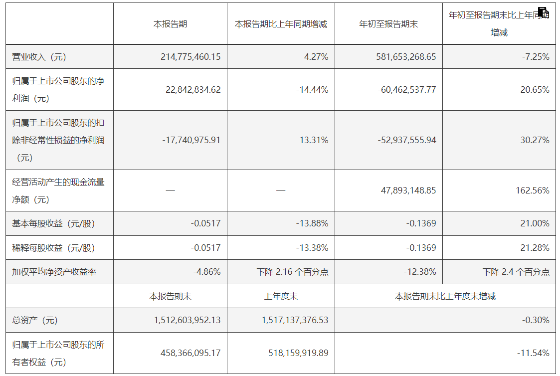 今年前三季度,该公司实现营业收入5.82亿元,同比下降7.25%;归母净利润亏损6046.25万元,较上年同期有所收窄。