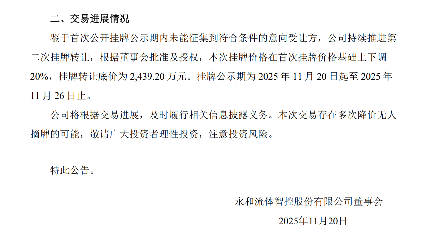 11月20日,永和智控在发布公告披露鉴于首次公开挂牌公示期内未能征集到符合条件的意向受让方,公司持续推进第二次挂牌转让。本次挂牌价格在首次挂牌价格基础上下调20%,挂牌转让底价为2439.20万元。