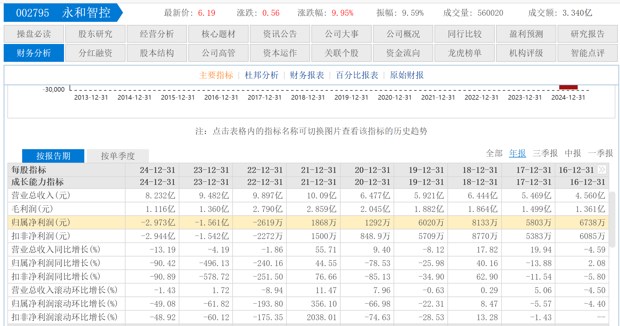 2022年至2024年,永和智控营业收入分别为9.90亿元、9.48亿元和8.23亿元,同比分别增长-1.86%、-4.19%和-13.19%;归母净利润分别为-2618.67万元、-1.56亿元和-2.97亿元,同比下滑240.16%、496.13%和90.42%。