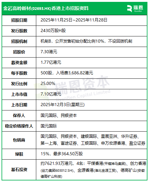 来自安徽淮北的煤系高岭土公司、新三板挂牌企业金岩高岭新材(02693.HK)(金岩高新872844.NQ),于今日(11月25日)起至周五(11月28日)招股,预计2025年12月3日在港交所挂牌上市,国元国际、民银资本联席保荐。