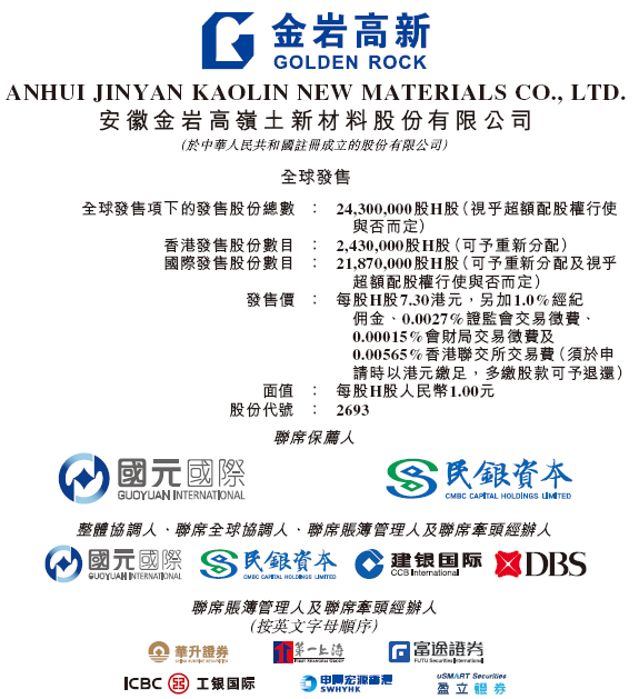 金岩高岭新材,计划全球发售2430万股H股(占发行完成后总股份的25%),其中90%为国际发售、10%为公开发售,另有15%超额配股权。每股发售价7.30港元,每手500股,入场费3,686.82港元,最多募资约1.77亿港元。