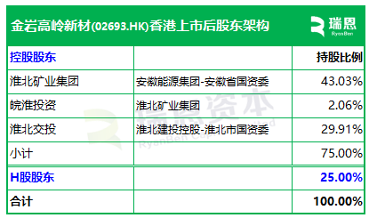 招股书显示,金岩高岭新材在上市后的股东架构中,安徽国资委通过直接及间接全资拥有的淮北矿业集团、以及淮北集团全资子公司皖淮投资分别持股43.03%、2.06%,合计持股45.09%;淮北市国资委,通过淮北交投持股29.91%;H股股东持股25%。
