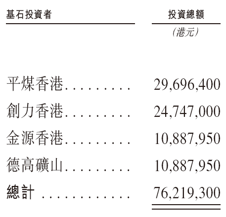 金岩高岭新材是次IPO招股引入4名基石投资者,合共认购7621.93万港元的发售股份,其中平煤神马集团通过平煤香港认购2969.64万港元、创力集团(603012.SH)通过创力香港认购2484.70万港元、淮北金源工贸通过金源香港认购1088.795万港元、德高矿山认购1088.795万港元。