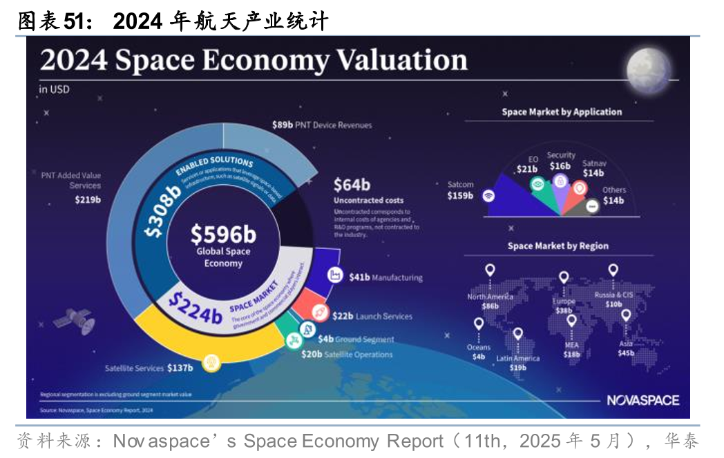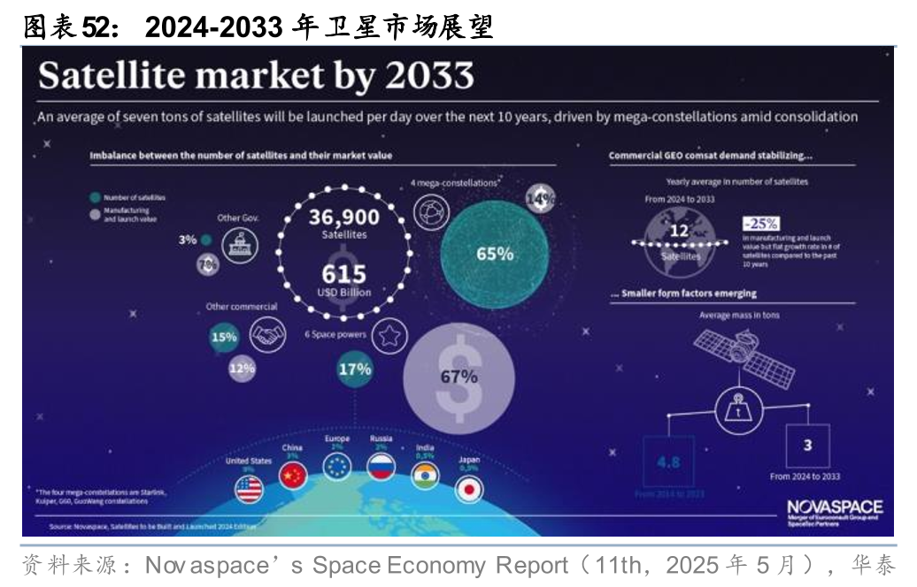 卫星产业市场空间广阔。近年来全球航天产业快速发展,根据Novaspace’s Space Economy Report(11th,2025年5月)统计,2024年全球航天市场约5960亿美元,其中制造端市场空间达到410亿美元;应用端方面卫星导航和卫星通信占比较高;商业航天已成为航天产业的支柱力量。预计2024-2033年,卫星制造和发射服务市场空间超6000亿美元,全球每年平均发射卫星数量约3700颗,卫星市场进入高速发展阶段。