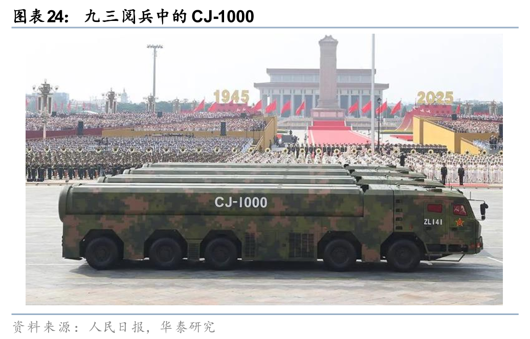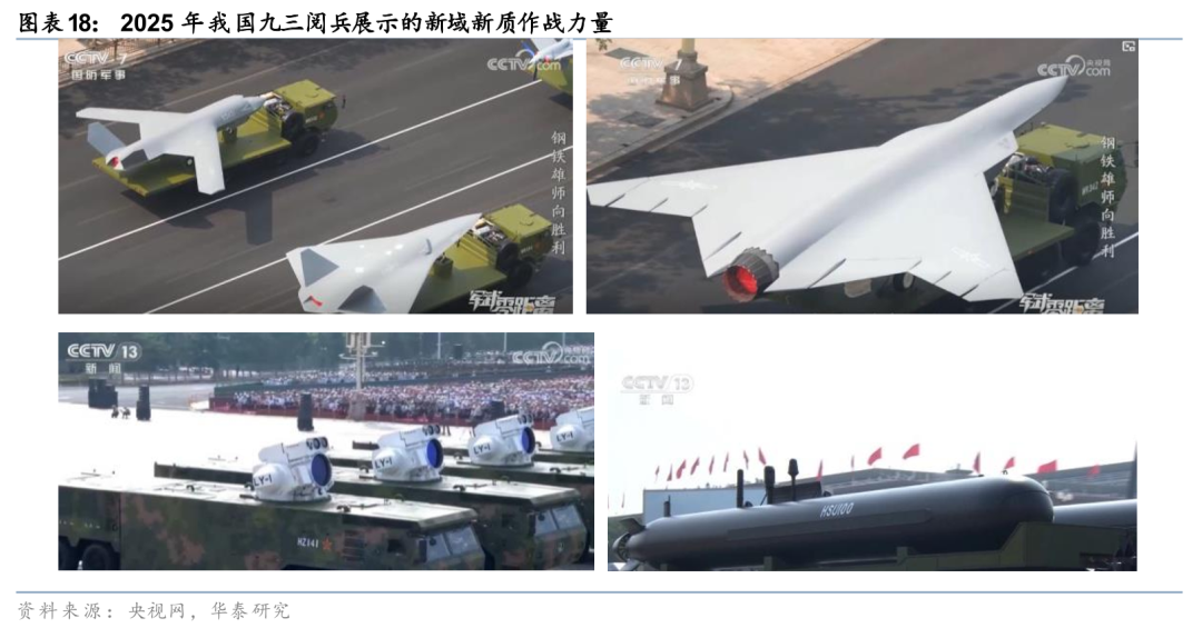 2025年九三阅兵中,我军在空中无人作战方队中展示了无人僚机、无人制空作战飞机等新装备,可隐蔽出击、广域覆盖、自主协同,创新未来空战新样式;在高超声速导弹方队展示了鹰击-21、东风-17、东风-26D导弹,飞行速度快,突防能力强,命中精度高,是具备全天候作战能力的新型杀手锏;在海上无人作战方队中展示了新型无人潜航器、无人艇、无人布雷系统,具备隐蔽布放封锁、自主探测识别、集群组网攻击等作战能力,是海上作战的奇兵利器;在反无人机方队中展示了反无弹炮系统、高能激光武器、高功率微波武器等装备,既能软杀伤、又能硬摧毁,是反制无人机的“铁三角”。我们认为,这些新域新质装备都有望在“十五五”实现规模化、实战化、体系化发展。