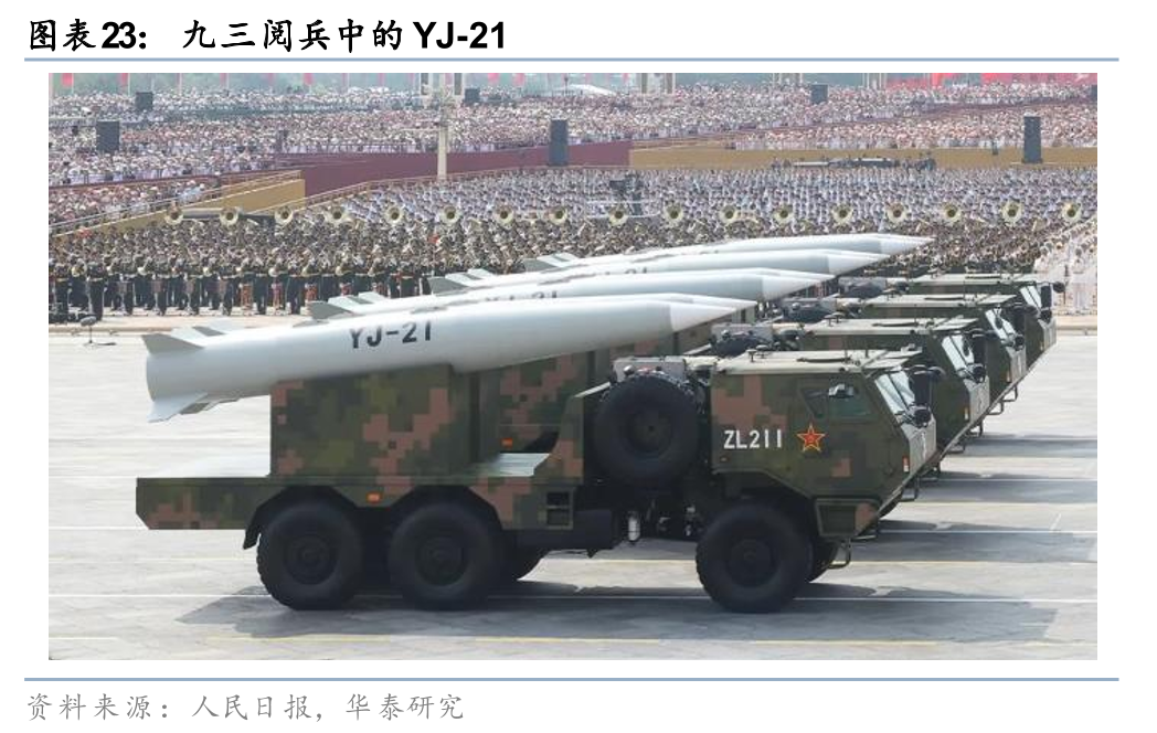 高超声速导弹成为世界多国军事战略及装备发展博弈新焦点。高超声速导弹指能够在临近空间和大气层内以超过5倍音速进行持续可控飞行,并可做大范围不规则机动的导弹武器系统,主要分为高超声速助推滑翔导弹和吸气式高超声速巡航导弹两类。因其飞行速度快、轨迹多变、难以预测,可使现有传统防空反导防御体系失效,成为了各军事强国竞争的焦点。九三阅兵中,我军多型高超声速导弹进行集中展示,包括鹰击-21、东风-17、东风-26D导弹,具有飞行速度快、突防能力强、命中精度高,是具备全天候作战能力的新型杀手锏。另外,在巡航导弹方队中,展示了火箭军新型高超声速巡航导弹长剑-1000。