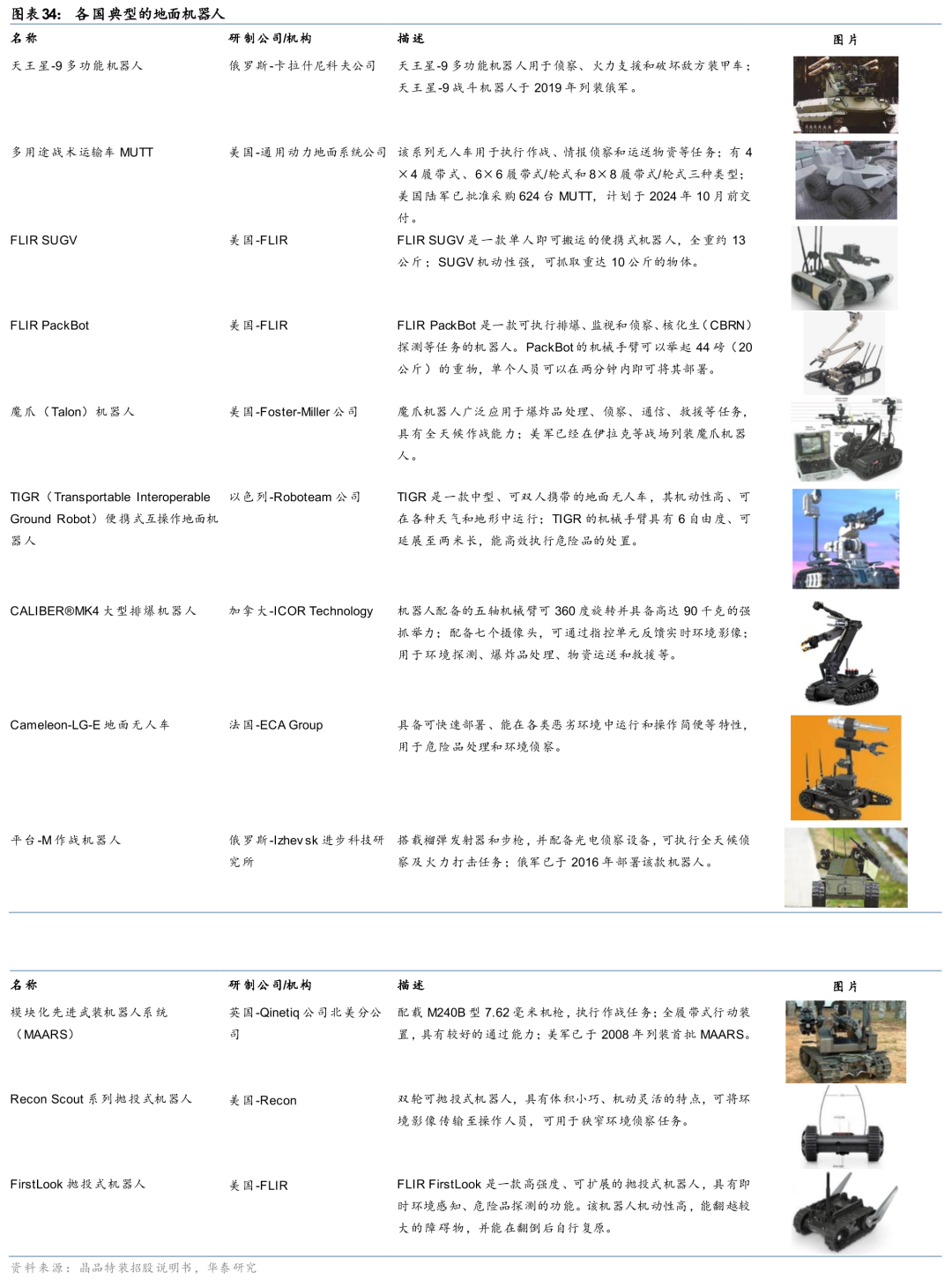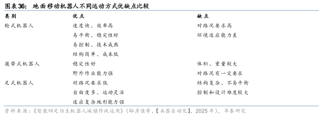 四足机器人具备多种优势,与传统轮式和履带式无人装备形成优势互补。四足机器人与传统轮式和履带式机器人相比,能够更灵活地跨越矮墙、攀爬楼梯、出入狭窄空间,适应泥泞、冰雪、瓦砾等恶劣地面条件,机动灵活,具有卓越的环境适应能力,可以携带各种载荷,执行多样化的任务,具有较好的军事应用前景。我们认为,在边境与军事基地巡逻、城镇作战等场景中,四足机器人的优势将更加明显。
