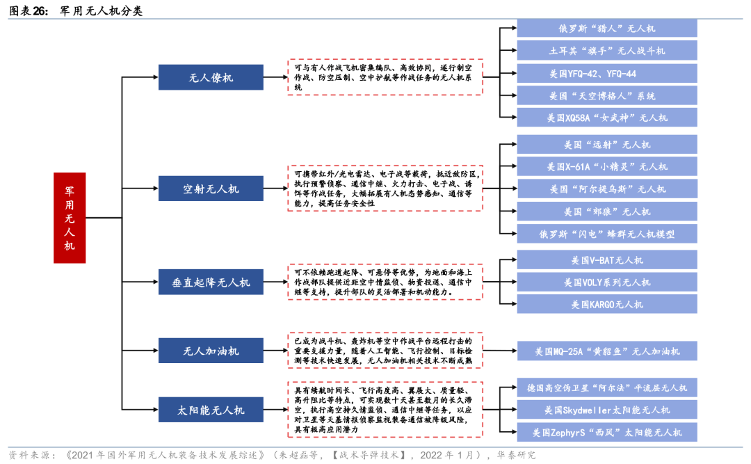 军用无人机种类齐全,可应用于各类作战任务。21世纪以来,军用无人机装备在世界范围内迅速扩散,频繁出现在阿富汗、叙利亚、利比亚等局部地区战场,由执行侦察等支援性作战任务向火力打击等主战任务转变,应用潜力不断提升。人工智能、飞控导航、网络通信等技术的发展,加快了无人机装备能力提升,使其任务谱系日益完善,先后发展出低成本可消耗无人机、无人僚机、无人加油机、空射无人机等多种新质装备,衍生出有人-无人协同、无人机蜂群等新型概念,使无人机装备运用形式不断拓展,加速推动无人化、智能化战争时代到来。