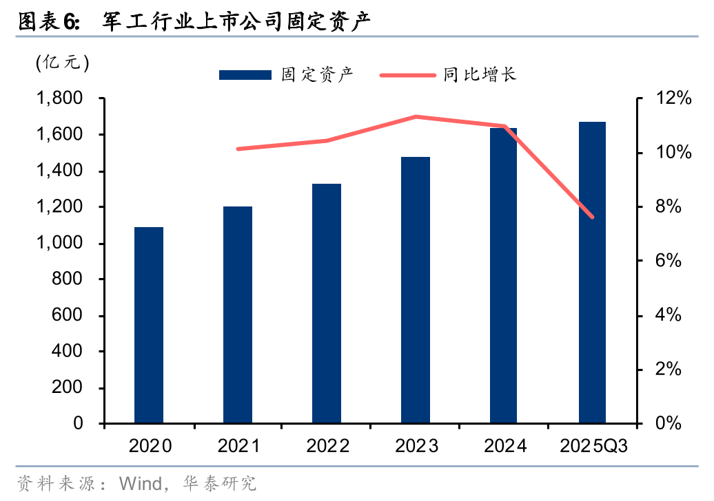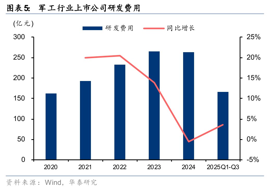武器装备科研生产能力持续提升。我国武器装备发展具有“探索一代、研制一代、生产一代、装备一代”的特征,“十四五”时期,我国武器装备科研生产能力持续提升。从研发投入看,119家军工上市公司2024年研发费用合计263.94亿元,较2020年研发费用合计161.30亿元增长63.63%;2025Q1-Q3,研发费用合计166.13亿元,同比增长3.62%。从装备生产能力看,119家军工上市公司2025Q3末固定资产合计1671.53亿元,较2020年末固定资产合计1089.32亿元增长53.45%。