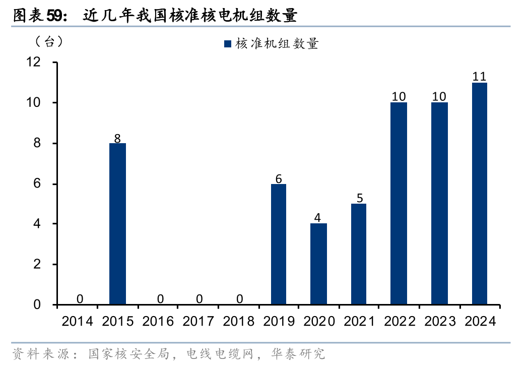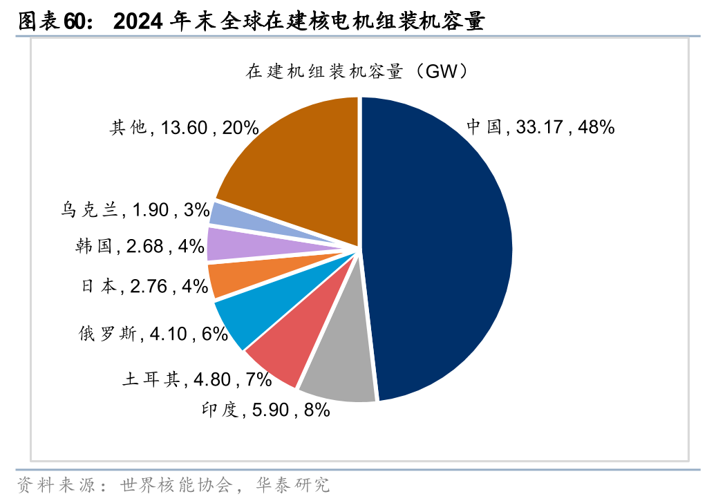 我国核电发展驶向快车道,三代核电批量化建造。国内从2019年开始恢复核电核准,2022-2024年,国内每年核准第三代压水堆核电机组数量均为10台,2024年另有一台高温气冷堆核电机组核准,合计核准机组数量达到11台。2025年4月27日,国内核准了广西防城港核电三期、广东台山核电二期、浙江三门核电三期、福建霞浦核电一期、山东海阳核电三期共10台新机组。国内已经连续4年,每年核准10台及以上核电机组,核电发展驶向快车道。从在建核电机组看,中国在建核电机组装机容量连续18年保持全球第一,截至2024年末,全球在建核电机组64台,合计装机容量68.91GW,其中,中国在建核电机组29台,占比45%,装机容量33.17GW,占比48%。