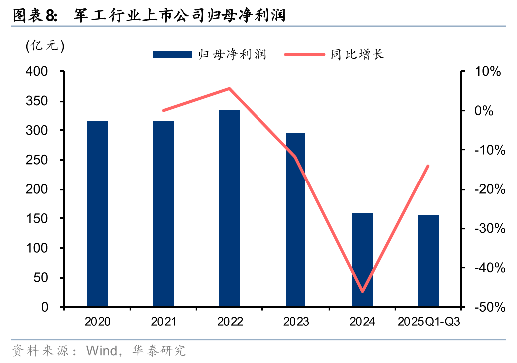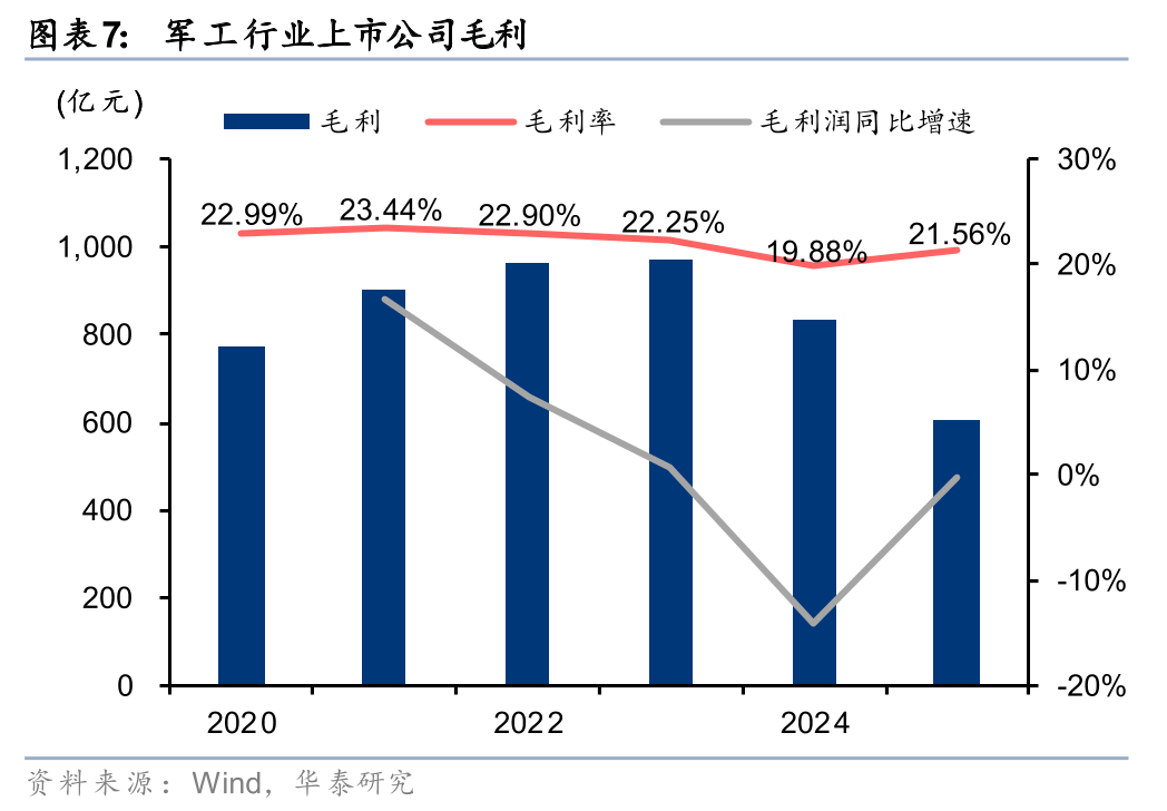 军工行业上市公司利润增长前高后低。2021年和2022年,受益于营收规模增长,119家军工上市公司毛利实现较快增长,毛利同比增速分别为16.73%和7.29%,毛利率维持在23%左右。2023-2024年,受客户需求节奏影响以及在“高质量、高效益、低成本、可持续”的武器装备发展背景下部分产品价格下调影响,业绩承压。2024年,119家军工上市公司实现毛利833.68亿元,同比减少14.13%,毛利率19.88%,同比降低2.38pcts,归母净利润158.56亿元,同比减少46.15%。2025Q1-Q3,军工行业需求恢复,119家军工上市公司合计营收同比增长3.23%,实现毛利604.06亿元,同比基本持平,毛利率21.56%,同比降低0.73pcts,归母净利润155.56亿元,同比减少13.89%。