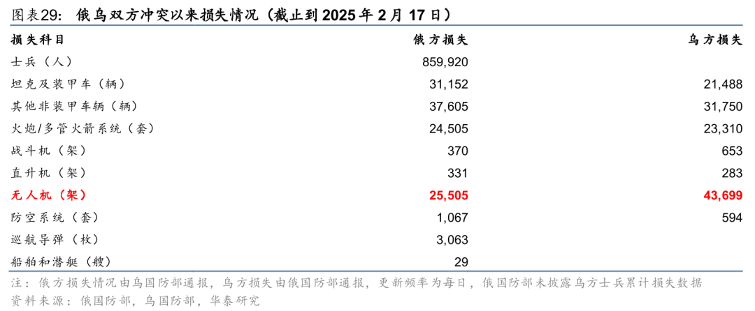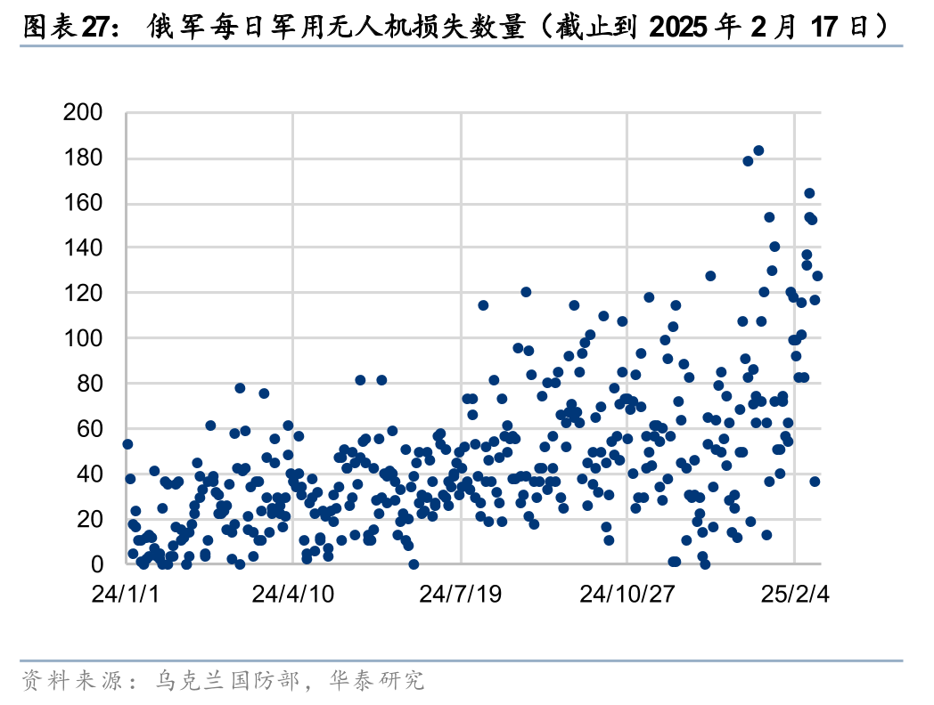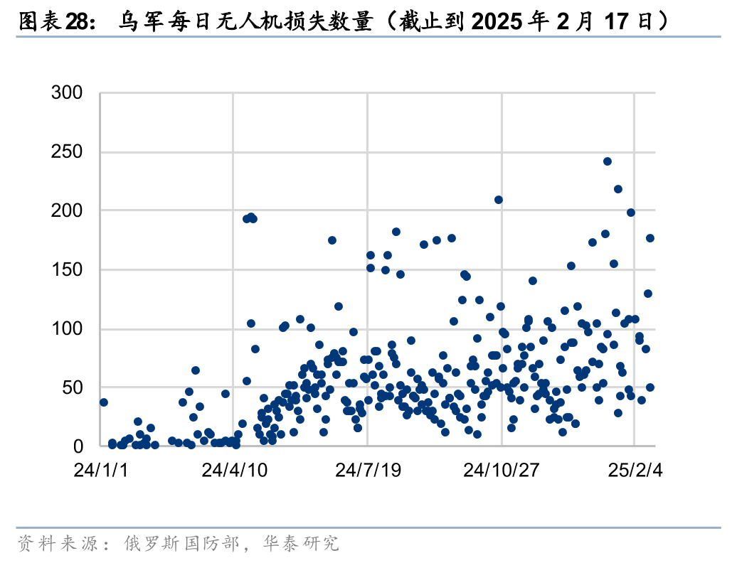 截至2025年2月17日,根据俄乌双方国防部的战损统计,自冲突发生以来乌克兰击落俄方军用无人机数量为25,505架,俄罗斯击落乌克兰军用无人机数量为43,699架(俄罗斯损失数量由乌克兰国防部统计,乌克兰无人机损失数量由俄罗斯国防部统计)。2024年以来,双方每日无人机损失数量呈增长态势,且该统计主要对象为飞行能力较强的军用无人机,并未包含前线大量使用的商用无人机,若加上商用无人机的损失则无人机整体损失规模十分庞大。根据RUSI的报告《Meatgrinder: Russian Tactics in the Second Year of Its Invasion of Ukraine》,2023年乌克兰每月损失无人机约1万架。