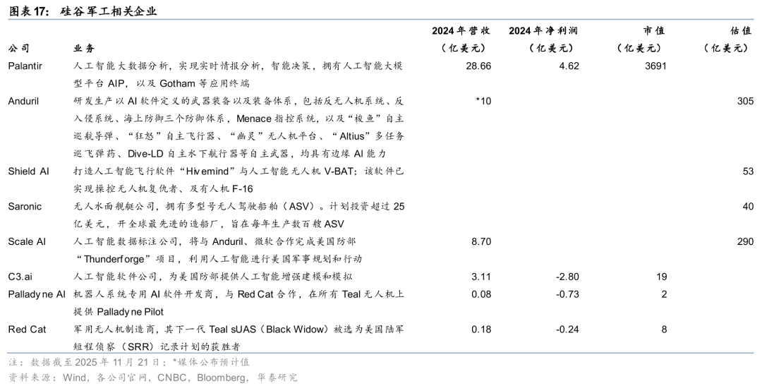 除Palantir、Anduril外,美国硅谷还涌现出Shield AI、Saronic、Scale AI、C3.ai、Palladyne AI、Red Cat等创新企业,联合SpaceX、OpenAI等企业共同竞标美国政府项目。