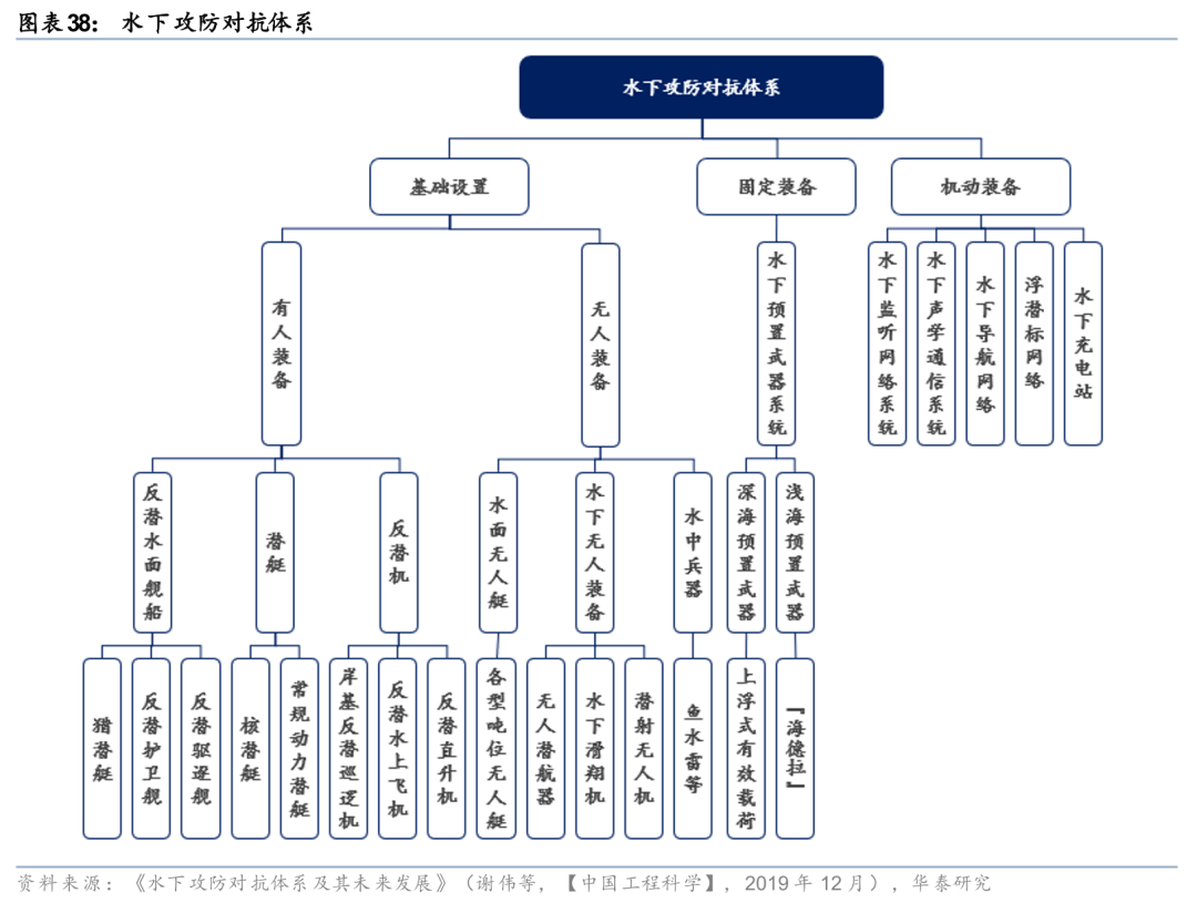水下攻防体系主要由机动装备、固定装备、基础设施三部分组成。依靠信息保障网络体系,形成侦察预警能力、指挥控制能力、隐蔽突防和打击能力、水下防御作战能力、水下信息战能力、综合保障能力,打造以核潜艇为主、攻击型UUV为辅的水下攻防对抗能力。