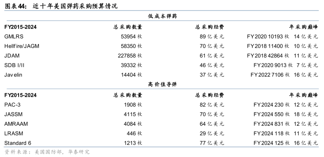 低成本弹药/导弹包括航空制导炸弹、远程火箭弹、单兵导弹等,美军对低成本弹药的采购数量比对高价值导弹的采购数量多1-2个数量级,采购金额大体相当。我们认为,低成本弹药/导弹有望在“十五五”期间进入放量阶段。
