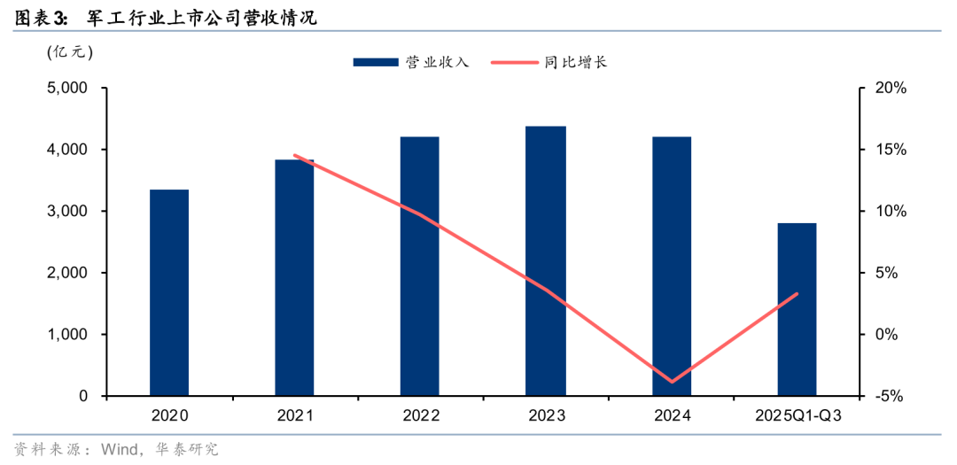 板块收入迈上新台阶,装备交付量大幅增长。“十四五”以来,随着新一代武器装备列装,军工板块营收规模迈上新台阶。2024年,中信国防军工指数119只成分股(剔除中航成飞上市的影响)实现营收合计4194.35亿元,较2020年营收合计3349.01亿元增长25.24%,复合增速5.79%;2025Q1-Q3,119家军工上市公司营收合计2801.84亿元,同比增长3.23%。