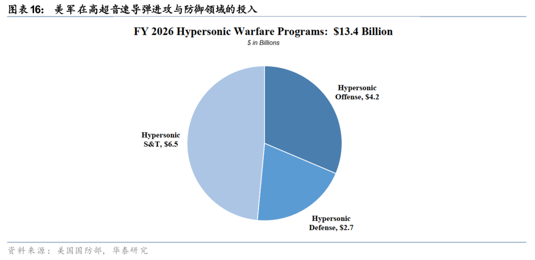 在太空与高超声速领域,美军持续高度重视并且投入巨大。2026财年,美军将大幅提升导弹预警/导弹跟踪卫星预算至130亿美元,同比增长176%,以覆盖导弹预警的所有阶段,并跟踪先进导弹威胁,包括高超音速导弹系统;在高超声速导弹进攻与防御领域布局了远程高超音速武器(LRHW)、中程常规快速打击武器(IRCPS)和高超音速攻击巡航导弹(HACM)等项目,2026财年高超音速作战项目总申请额为134亿美元。