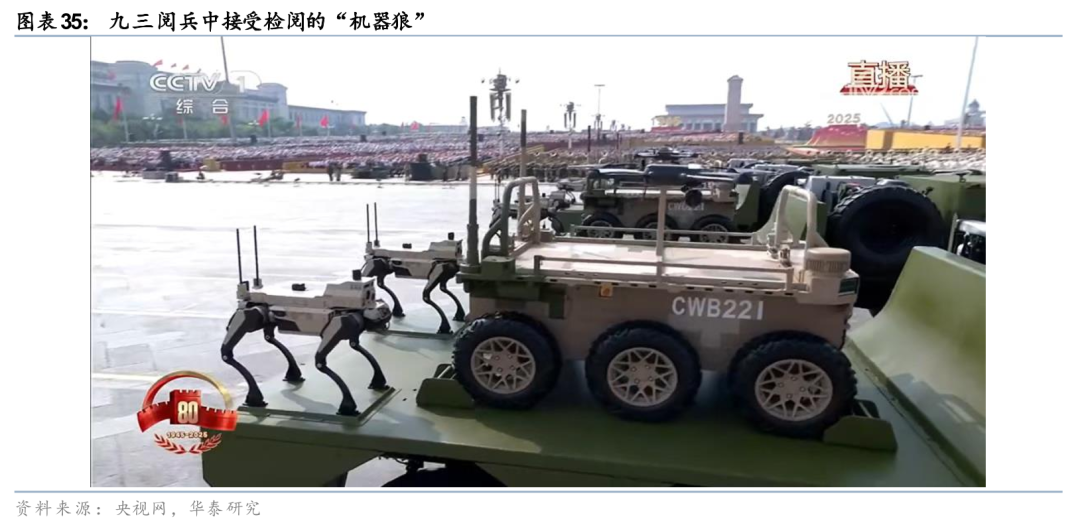 仿生机器人走上阅兵场,国产四足机器人迎来应用时代。在2025年九三阅兵中,国产四足机器人在陆上无人作战方队接受检阅。这是建国以来仿生智能机器人首次接受检阅,四足机器人作为陆上无人作战方队的重要组成部分,向世界展示了中国军队在智能化建设上的最新成果和未来方向。根据此前国防部在阅兵吹风会上的介绍,本次阅兵中的装备均为现役装备,表明国产四足机器人已经列装部队。