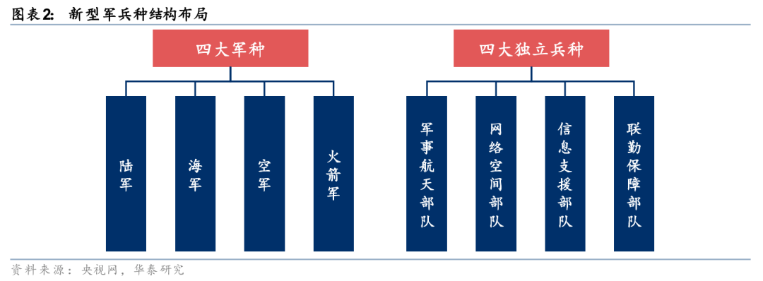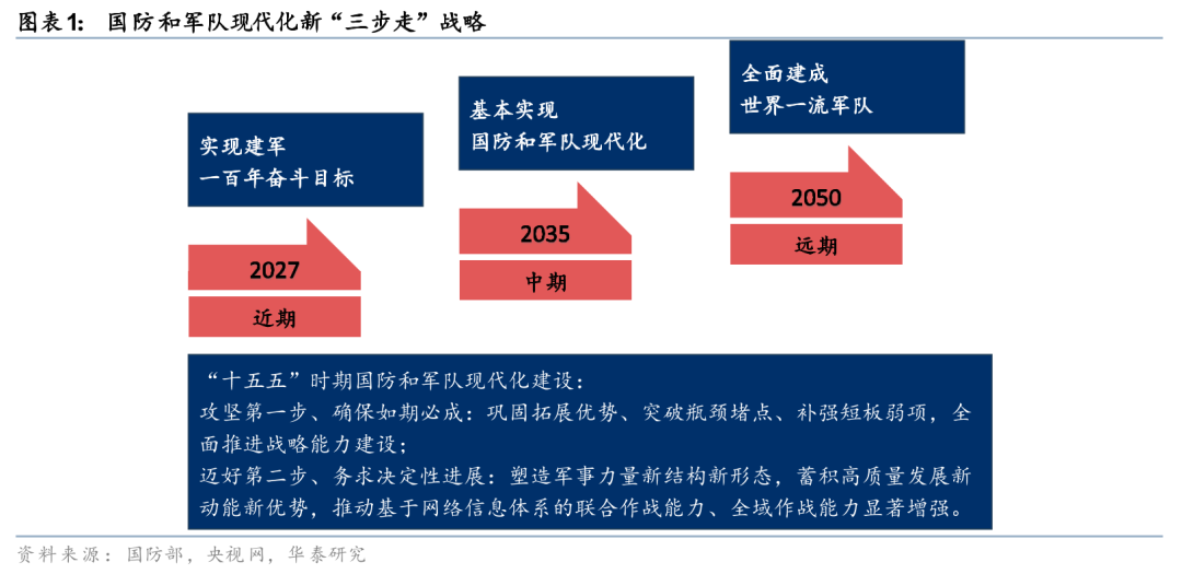 国防和军队现代化新“三步走”战略提出,到2027年实现建军一百年奋斗目标、到2035年基本实现国防和军队现代化、到本世纪中叶全面建成世界一流军队的国防和军队现代化。“十四五”时期,我军构建起“4支军种+4支兵种”的新型军兵种结构布局,并且以机械化为基础、信息化为主导、智能化为方向,武器装备建设实现跨越式发展。