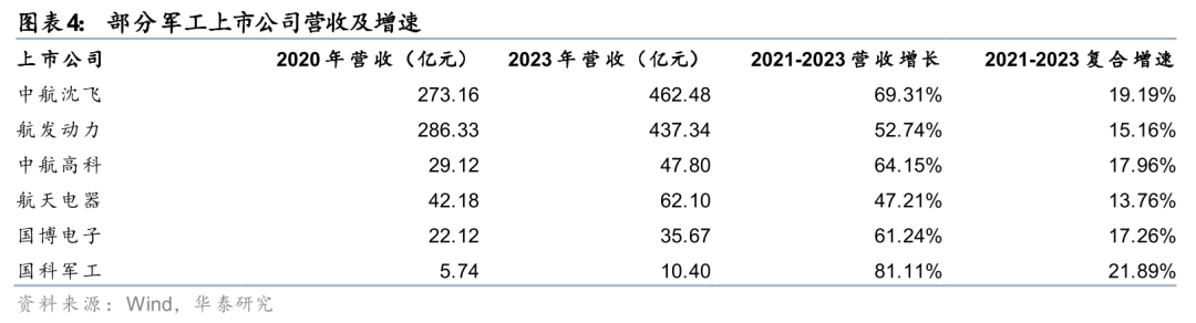 “十四五”期间,部分军工上市公司营收也迈上新台阶。由于部分公司2024年在客户采购节奏变化等影响下出现营收波动,我们参考2020-2023年的营收变化。飞机产业链中,中航沈飞、航发动力、中航高科2023年营收相较2020年营收的增幅分别为69.31%、52.74%和64.15%,2021-2023年营收复合增速分别为19.19%、15.16%和17.96%;导弹产业链中,航天电器、国博电子、国科军工2023年营收相较2020年营收的增幅分别为47.21%、61.24%和81.11%,2021-2023年营收复合增速分别为13.76%、17.26%和21.89%。