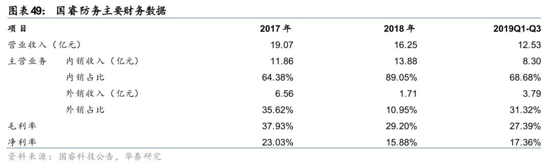 国内,国际化业务占比较高的国睿防务盈利能力领先。国睿科技子公司国睿防务以承接十四所以国际化经营为导向的雷达业务经营性资产而设立,主要从事与国际防务有关的雷达产品的研制、生产、销售和相关服务。2017年,国睿防务实现营业收入19.07亿元,其中,内销收入11.86亿元,占比64%,外销收入6.56亿元,占比36%,销售毛利率37.93%,净利率达23.03%;2018年,国睿防务营收16.25亿元,外销收入占比降至11%,销售毛利率同比降低8.73pcts为29.20%,净利率同比降低7.15pcts为15.88%。